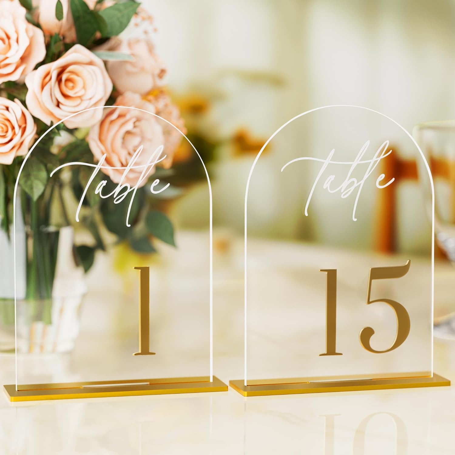 Arch Wedding Table Numbers 1-15 with Stands, Elegant Gold Number 5.5 x 7” Arch Acrylic Signs with Holder, Clear Acrylic Table Numbers for Wedding Reception, Anniversary, Party, Events