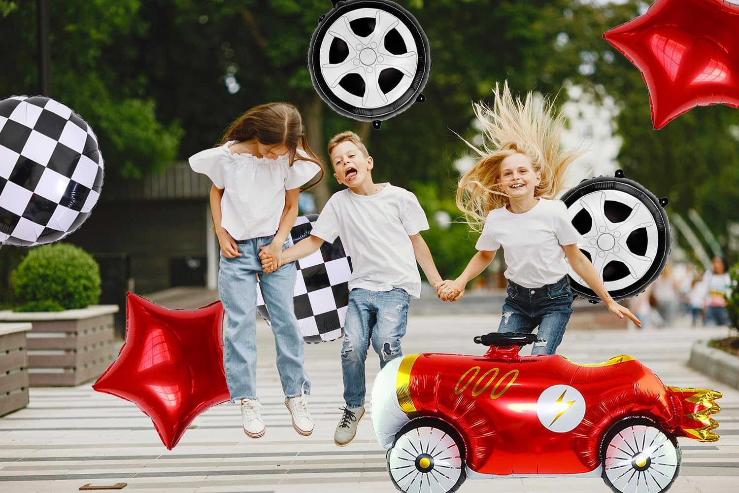 - 【 Appearance and Design 】 These aluminum foil balloons are designed in the shape of retro racing cars, wheels and tires, as well as black and white squares. The vivid and realistic appearance of the racing cars will attract the attention and interest of guests, bringing them a pleasant mood. You will receive 1 colorful racing balloon +2 wheel balloons +2 black and white checkered balloons +2 red star-shaped balloons (uninflated) + 1 ribbon roll.