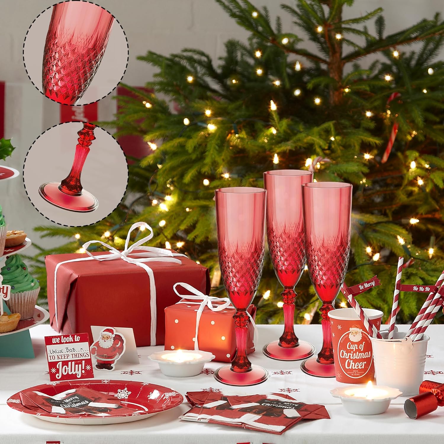 - Charming Set: Champagne flutes set include 24 retro-style dark red champagne plastic wine glasses, providing ample quantity to meet your daily use and replacement needs. A suitable champagne cup is the icing on the cake. Plastic wine glasses not only carry the wine, but also carries the laughter and blessings