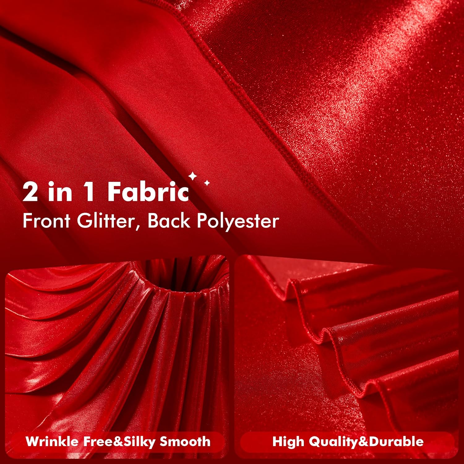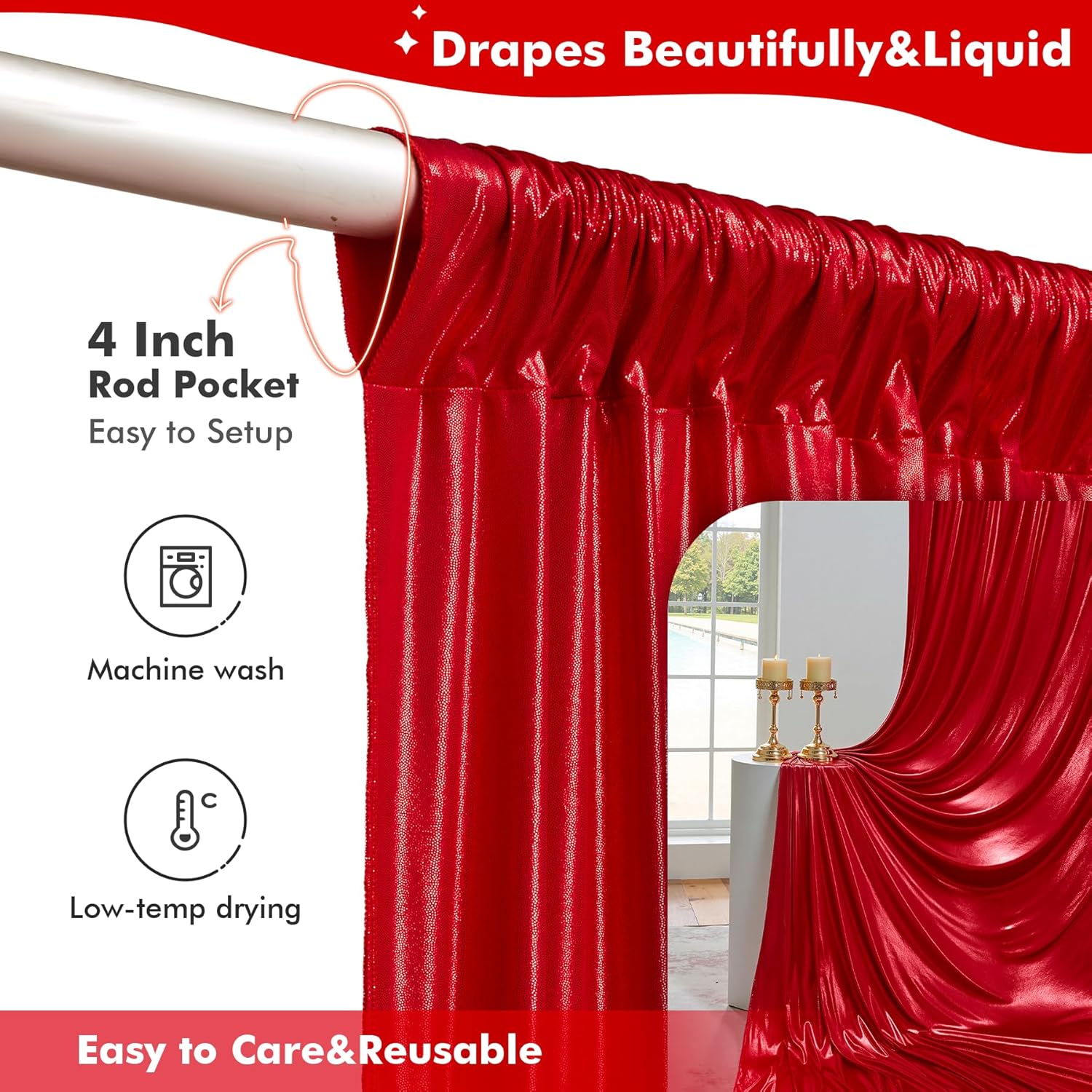 - For Kinds of Occasions - Our 10ft red sequin glitter polyester drapes are perfect for kinds of occassions. Such as wedding party, baby showers, birthday parties, photo booth,anniversary,graduation, home decoration and more.