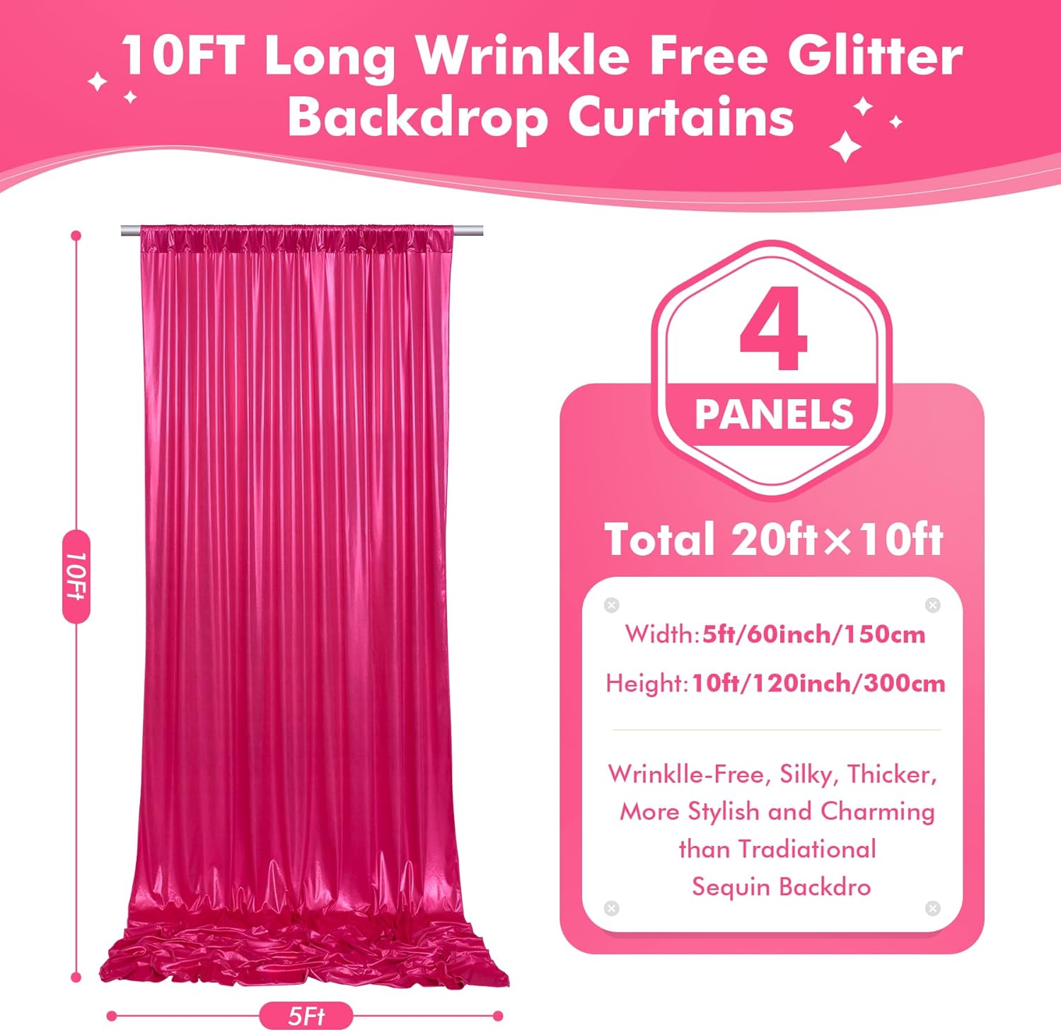 - Not See Through 10FT Glitter Backdrop Curtains - Your package will come with 4 panels hot pink sequin glitter photography backdrop drapes. Each purple background panels measures 5ft width and 10ft height.Entire backdrop curtain measures 20ft x 10ft.