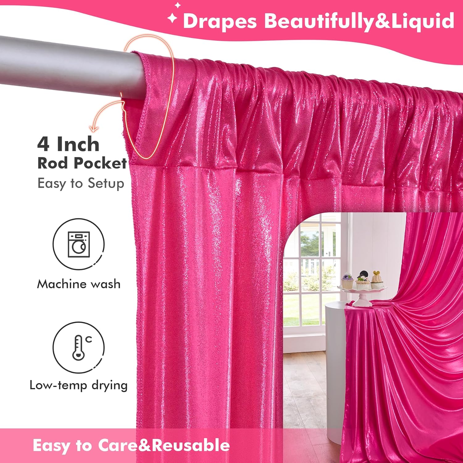 - Wrinkle-Free Backdrop Curtain - Our 10ft hot pink sequin glitter party background curtain panels are made of wrinkle-free material, which could be used without ironing. Let you make unforgettable memories for your family or your friends.