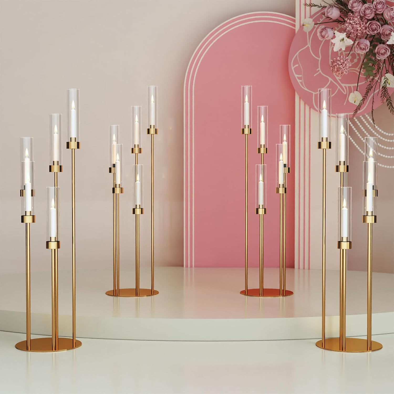 - UNIQUE DESIGN: Our 4pcs floor candle holders for wedding is 5 arms, staggered, very unique, the appearance is golden, elegant and noble. The matching transparent acrylic cover adds a bit of elegance to the whole product. Note: Our products feature a protective film on the bottom. Simply peel it off to reveal the gold finish. This film is included to prevent scratches on the product