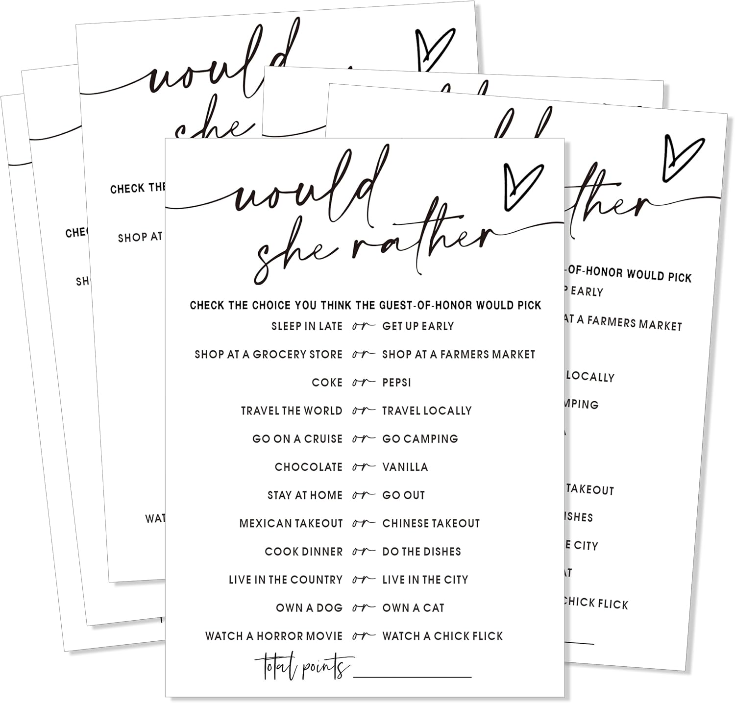 Fun Bridal Shower Games Set 25 Wedding Games Cards, Would She Rather Bridal Shower Game for 25 Guests Engagement Party Wedding Entertainment, Minimalist Newlywed Party Supplies - A11