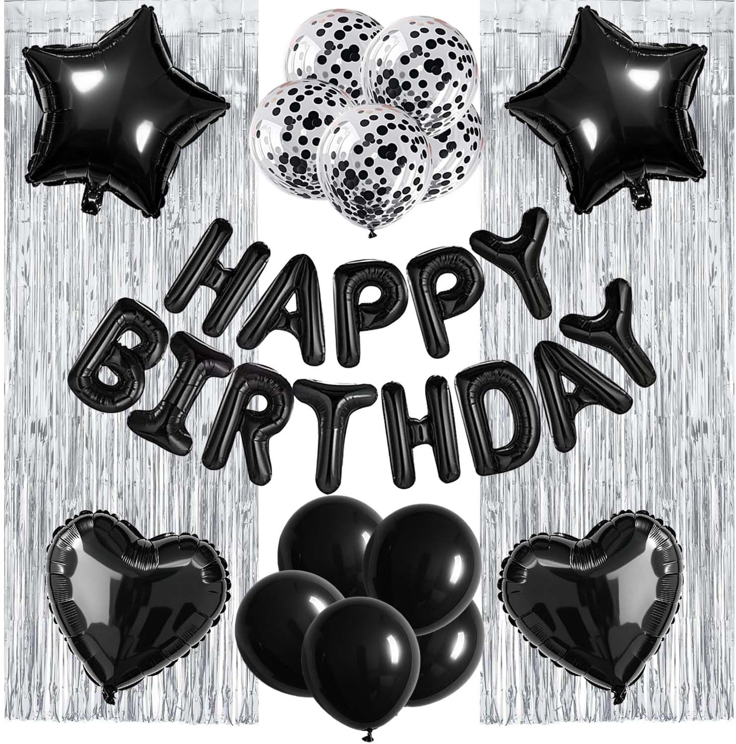 - Happy Birthday Balloon Kit: 13pcs 18inch aluminum foil happy birthday letters, 2 pack silver foil fringe curtains, 2pcs 18inch pentagram star balloons, 2pcs 18inch heart balloons, 5pcs 12inch Black confetti balloons, 5pcs 12inch Black balloons