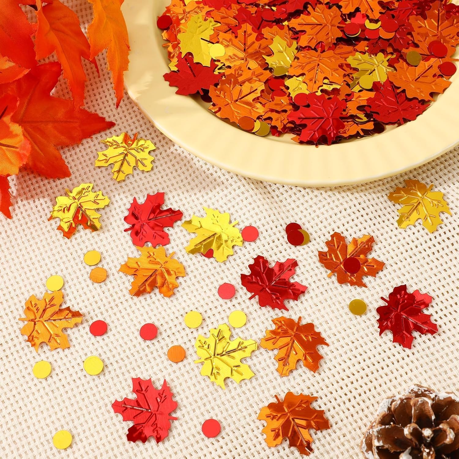 - Diverse Styles: Thanksgiving confetti is inspired by the beautiful colors of maple leaves in autumn, matched with small discs with appropriate size and color matching, and decorated with beautiful autumn decorative themes to help you decorate various parties in autumn and Thanksgiving