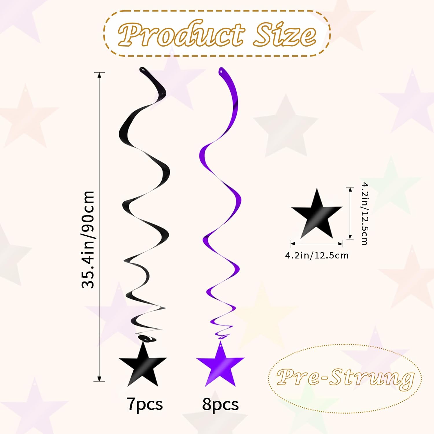 - 【Package include】A total of 15 pcs hanging swirl decorations, including 15 double swirls and 15 swirls with PVC star. There are 15 strings in total, each of which is connected with a double swirls and a PVC star. Flexible swirls, hanging length can extend to approx 36"/91cm long.