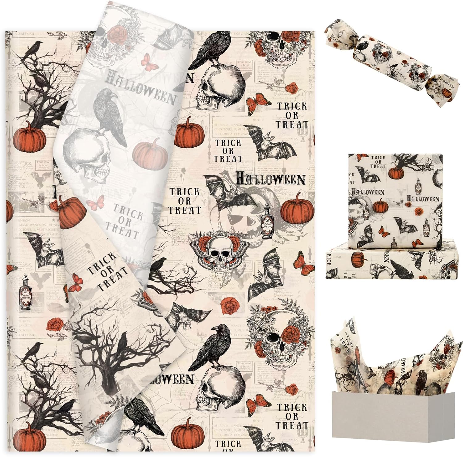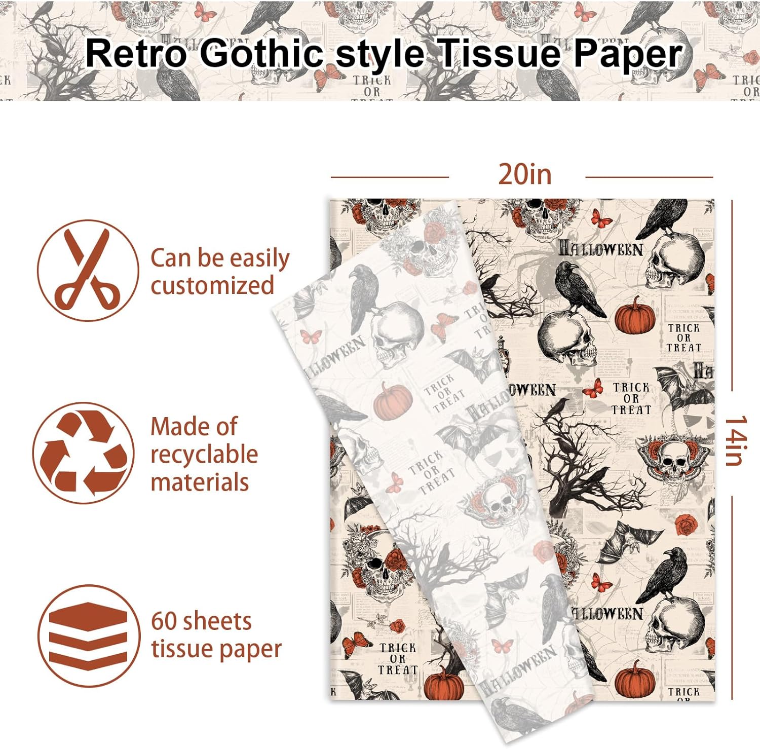 JarThenaAMCS 60 Pcs Halloween Tissue Paper Retro Gothic Skull Crow Pumpkin Wrapping Paper Decorative Art Tissue for Home Party Trick or Treat DIY Crafts, 14 x 20 Inch