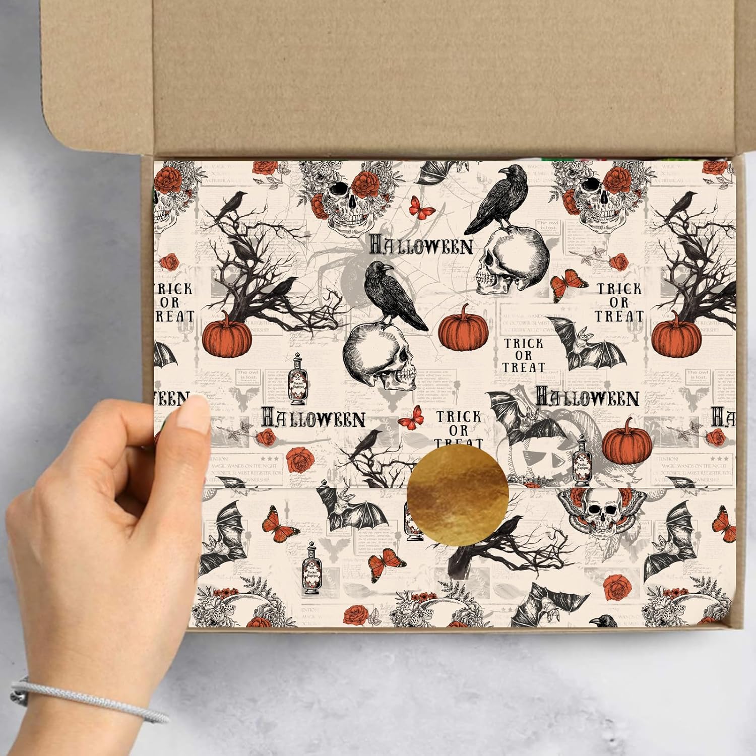 - GOTHIC STYLE: Our Halloween tissue paper is patterned with skull, crow, pumpkin and other elements, full of gothic style and vintage, great atmosphere creator for Halloween party