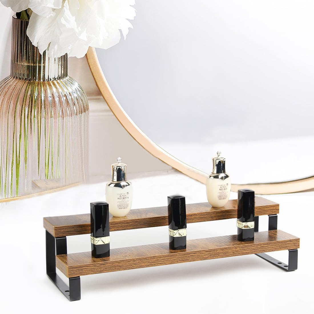 4-Tier Wooden Display Riser Shelf Stand for, Makeup, Cupcake, Condiment & Dolls Collection Home Decor Organizer, Expandable for Pantry/Counter (Brown, 2-Tier)