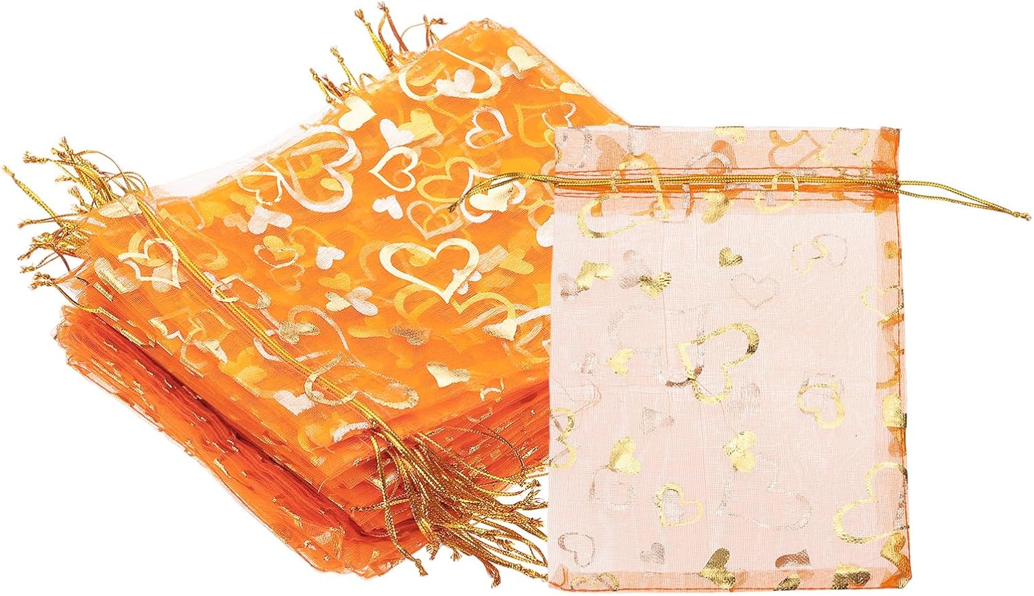 - Color: Orange; Material: Polyester; Size: 18x13 cm/7.09x5.12 Inch(L*W); Packing List: 100 Pcs x Heart Printed Organza Bags (NOTE: Please confirm the size before choosing our product)