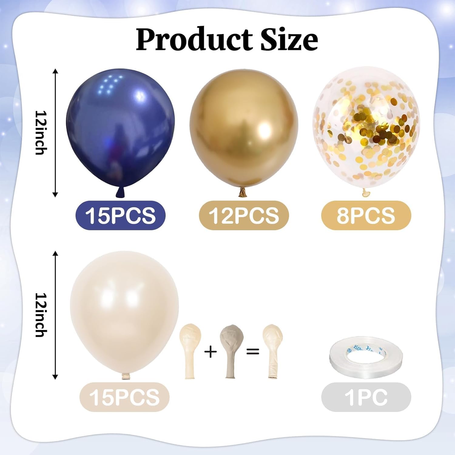 - Double Stuffed Pearl Navy Blue Balloons Set: This 12 inch balloons package includes 15pcs pearl navy blue balloons, 15pcs double stuffed pearl white sand balloons, 12pcs metallic gold balloons, 8pcs Gold Confetti balloons. Arrives ready to use with ribbon—just inflate and decorate. Brighten up your party space with our balloons!