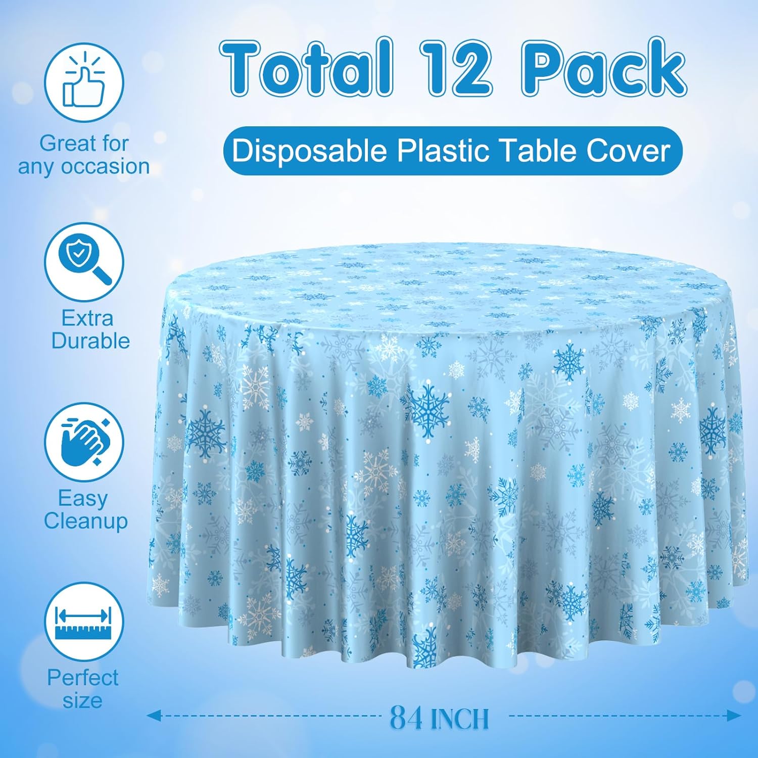 12 Pcs Christmas Snowflake Plastic Party Tablecloth Decorations,Disposable Light Blue Snowflake Round Table Cover Backdrop for Winter Onederland Christmas Holiday Party Supplies,84 inch (Light Blue)