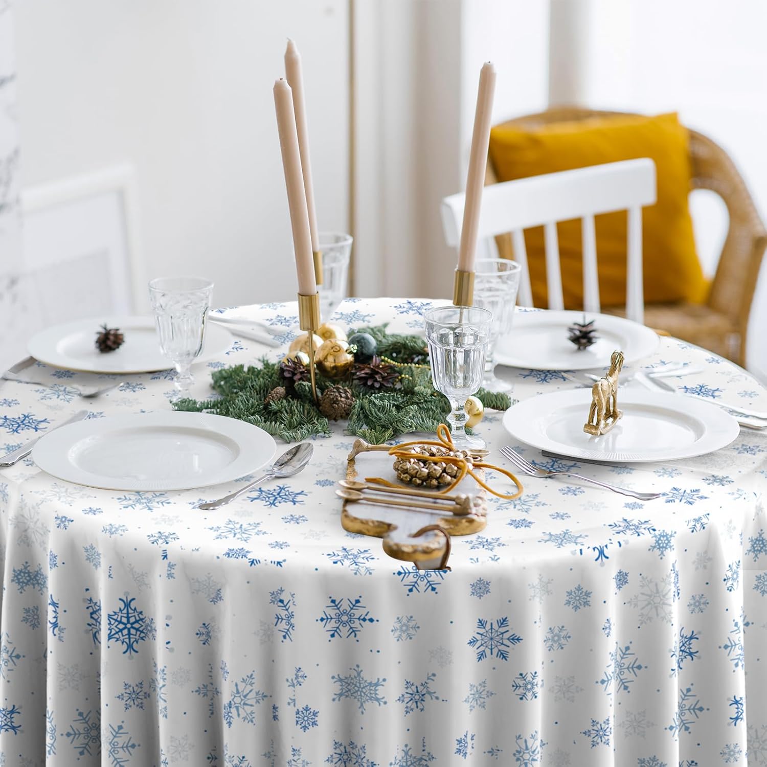 - Extra large size: these blue snowflake Christmas party tablecloth measures approx. 84 inch, which fits for various-sized tables that can accommodate 8-10 people, It’s large enough for your to hold a winter holiday and Christmas theme party with your family and friends to share happiness