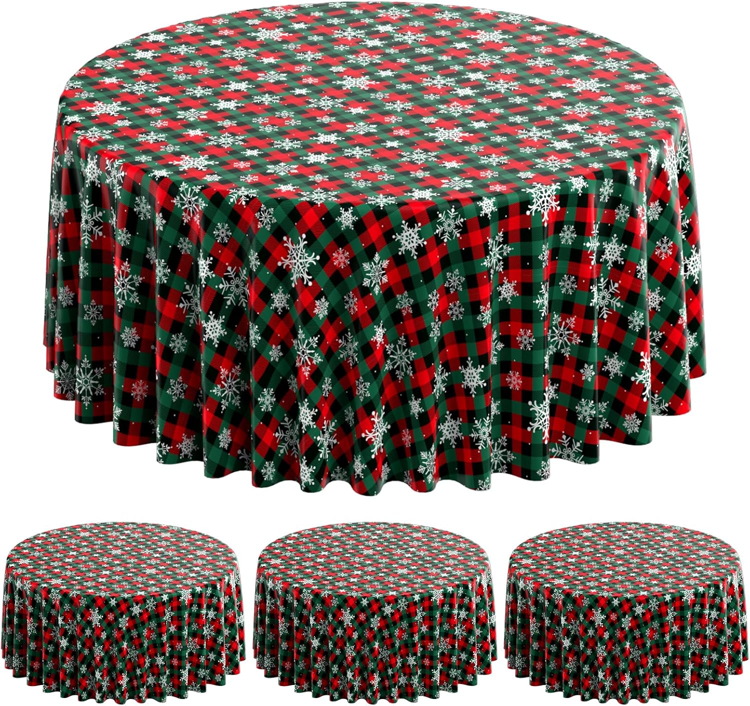 - What will you receive: 3 pieces round Christmas party tablecloth,all over printed with white snowflake patterns on red and green buffalo plaid background,ideal for decorating your winter holiday and Christmas party supplies and decorations