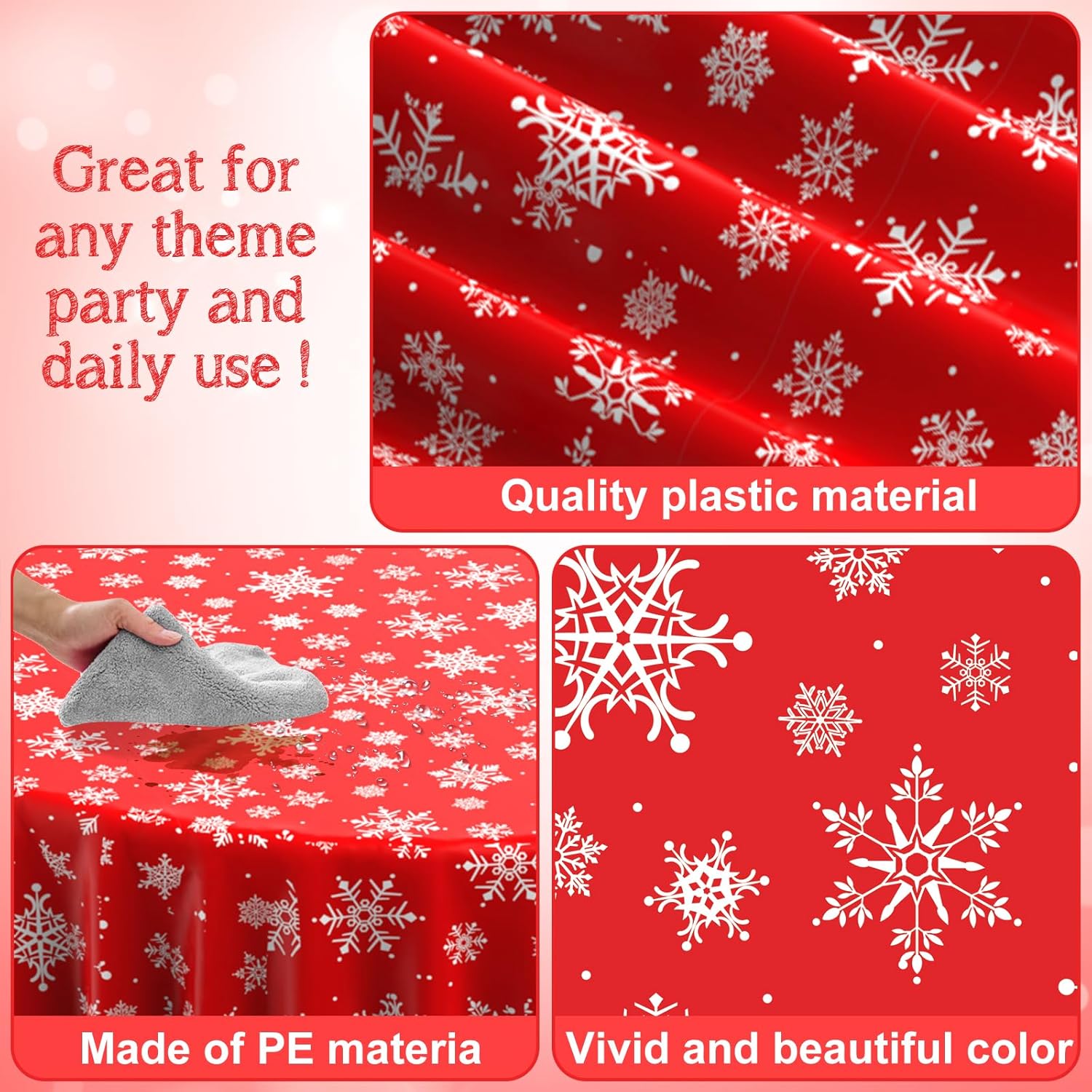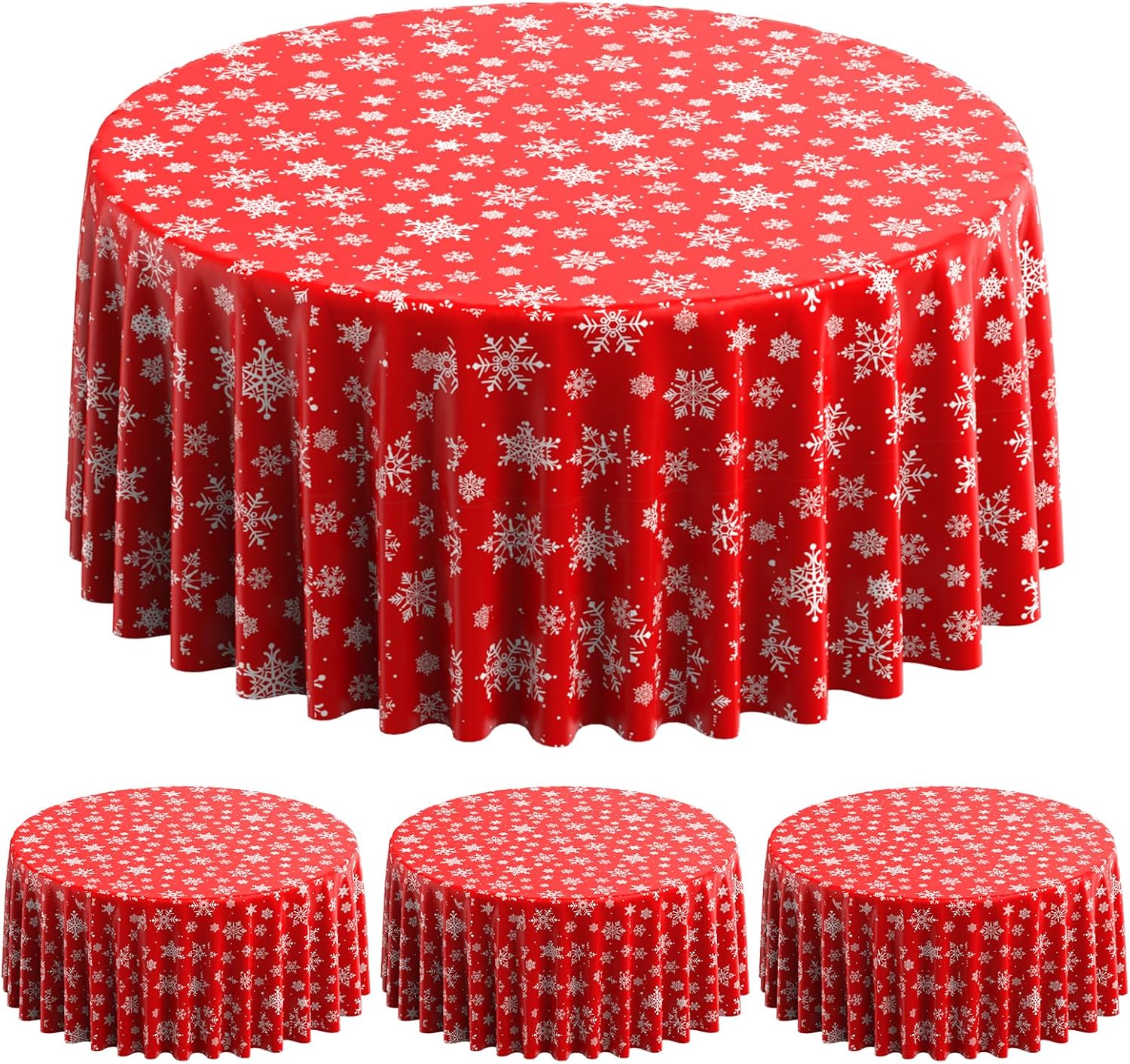 - What will you receive: 3 pieces round Christmas party tablecloth,all over printed with white snowflake patterns on bright red backdrop,ideal for decorating your winter holiday and Christmas party supplies and decorations
