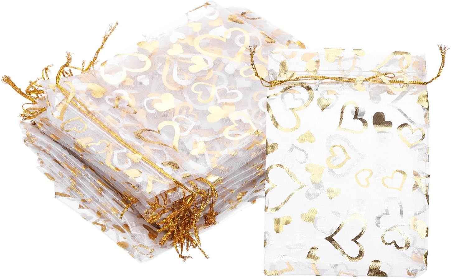 - Color: Gold Silver; Material: Polyester; Size: 16x11 cm/6.3x4.33 Inch(L*W); Packing List: 50 Pcs x Heart Printed Organza Bags (NOTE: Please confirm the size before choosing our product)