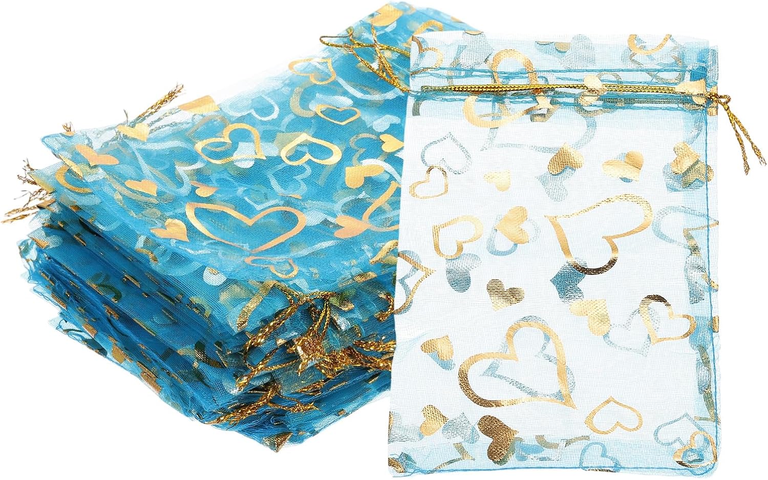 - Color: Lake Blue; Material: Polyester; Size: 16x11 cm/6.3x4.33 Inch(L*W); Packing List: 50 Pcs x Heart Printed Organza Bags (NOTE: Please confirm the size before choosing our product)