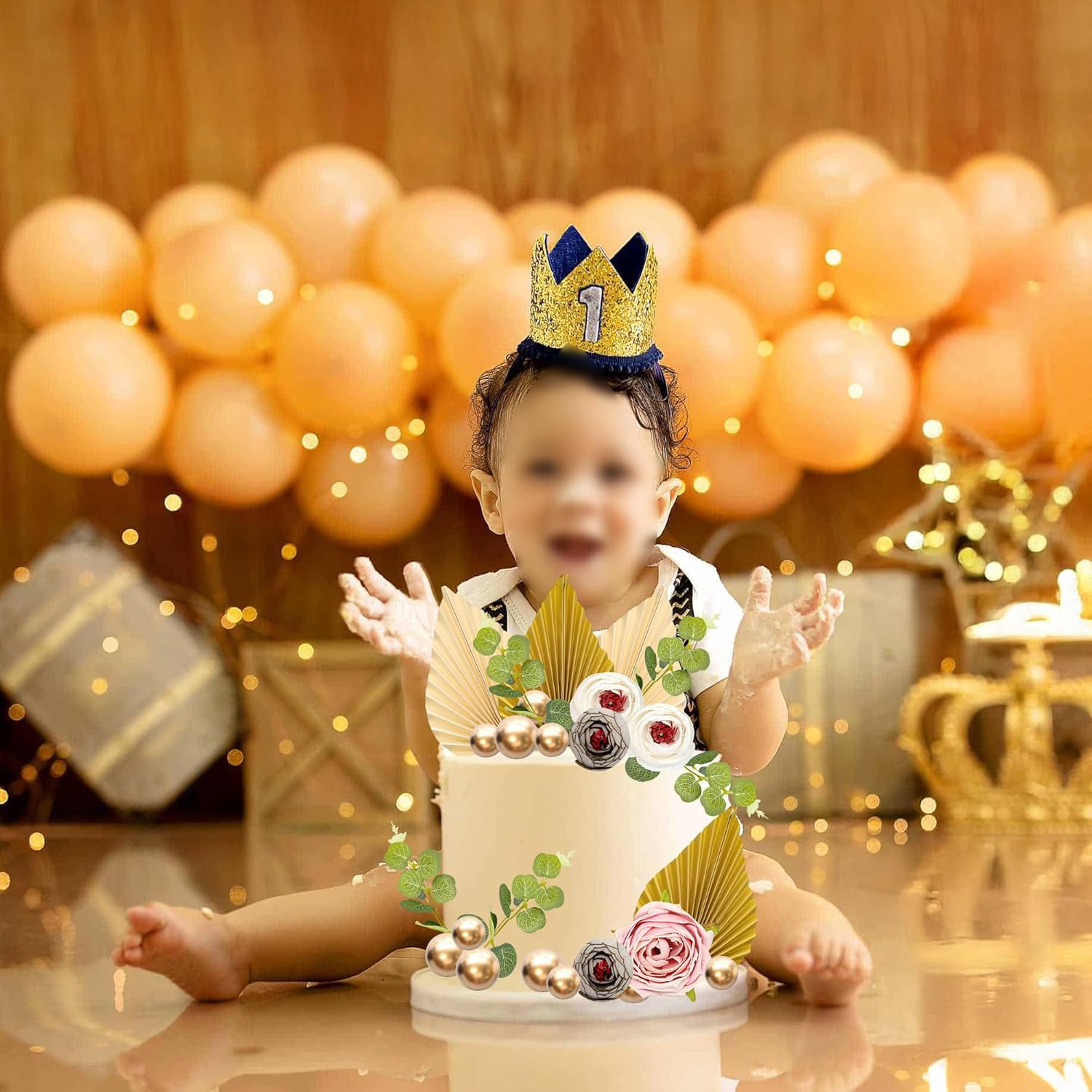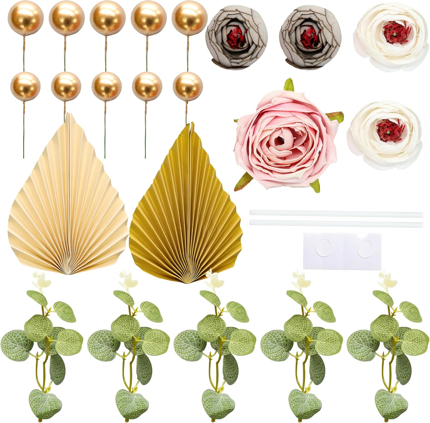 Gyufise 22Pcs Rose Artificial Flower Leaves Cake Topper Decorations Gold Balloon Cake Toppers Leaf Paper Palm Fan Cake Picks for DIY Wedding Birthday Valentine's Day Party Decorations Supplies Beige