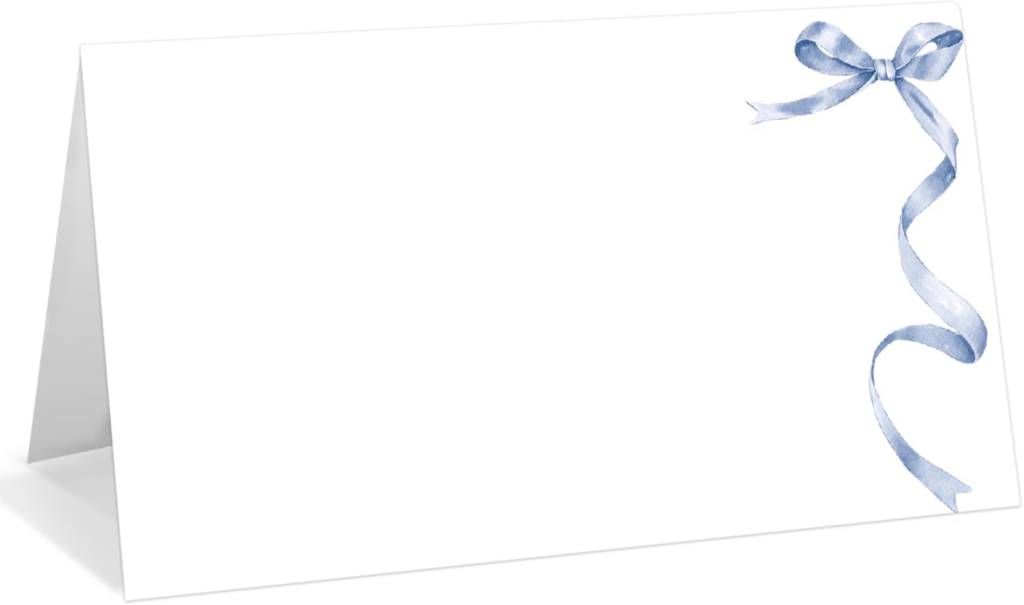 25 Pack Blue Bow Place Cards, Editable Name Cards for Table Setting, Tent Cards Food Label for Dinner Party, Bridal Shower, Wedding, Baby Shower and Events -T27