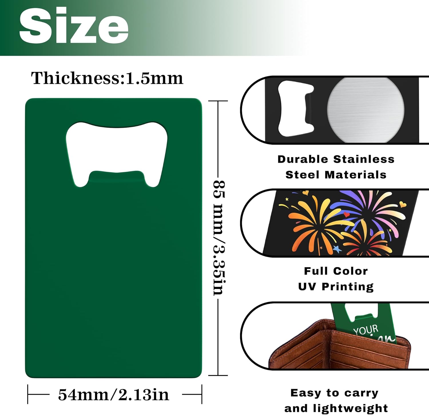 - Premium Material: Made from premium stainless steel for wear resistance and colorfastness, easy to fit in pocket. Credit card bottle openers allows you to open bottles with ease. Product dimensions are 3.35 x 2.13 inches / 8.5 x 5.4 cm.