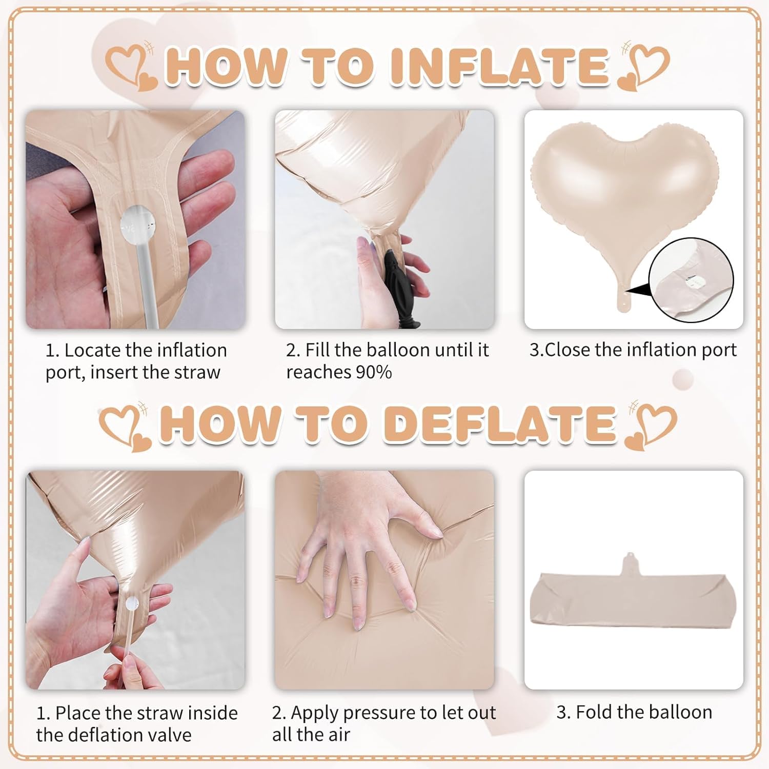 - Easy to Use - Effortlessly inflate our heart shaped foil balloons using the included straw. (If you want a floating effect, you can use helium)Simply pinch the self-sealing valve when full. It can be easily hung on the wall, ceiling or balloon garland, and it looks more advanced as a photo-taking tool!