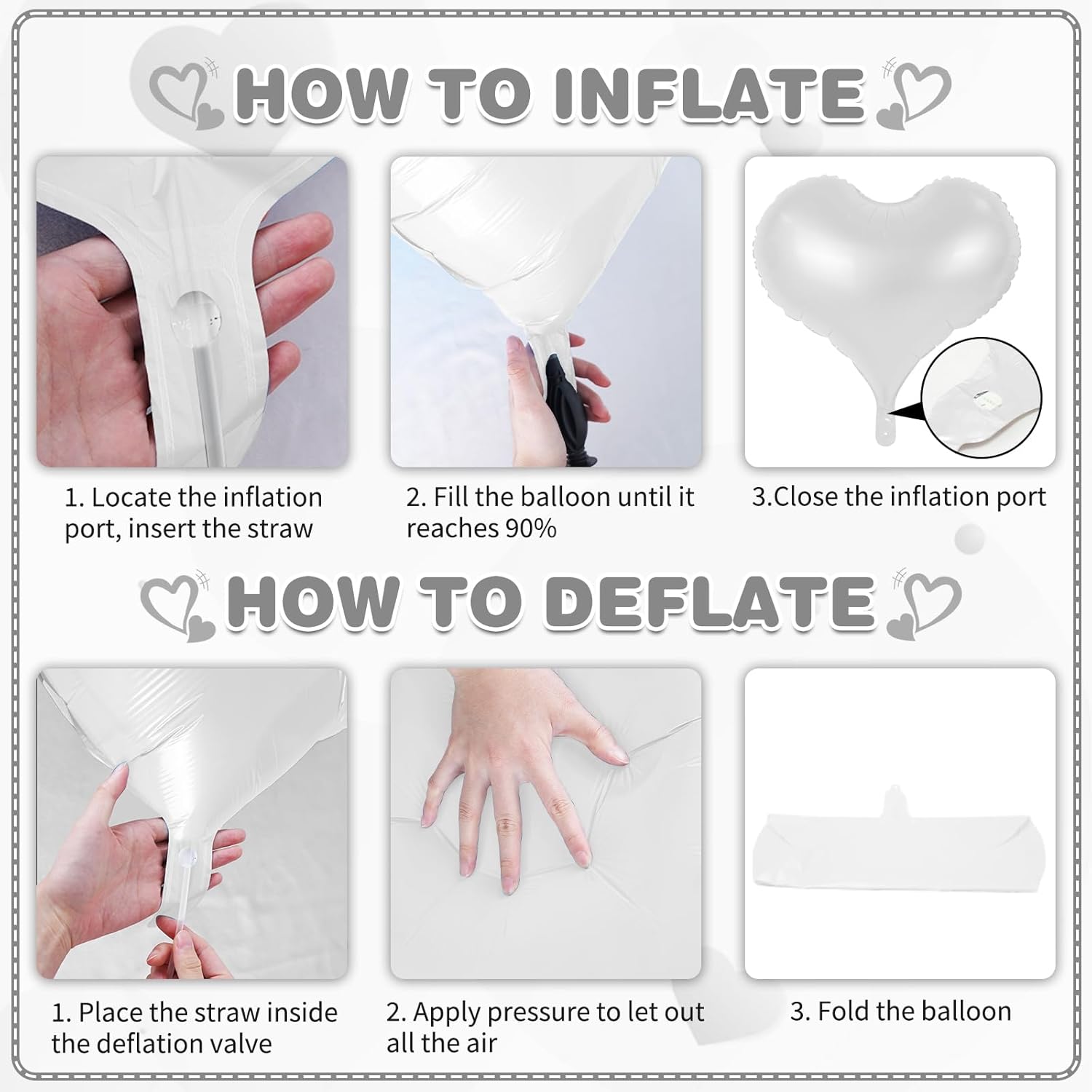 - Easy to Use - Effortlessly inflate our heart shaped foil balloons using the included straw. (If you want a floating effect, you can use helium)Simply pinch the self-sealing valve when full. It can be easily hung on the wall, ceiling or balloon garland, and it looks more advanced as a photo-taking tool!