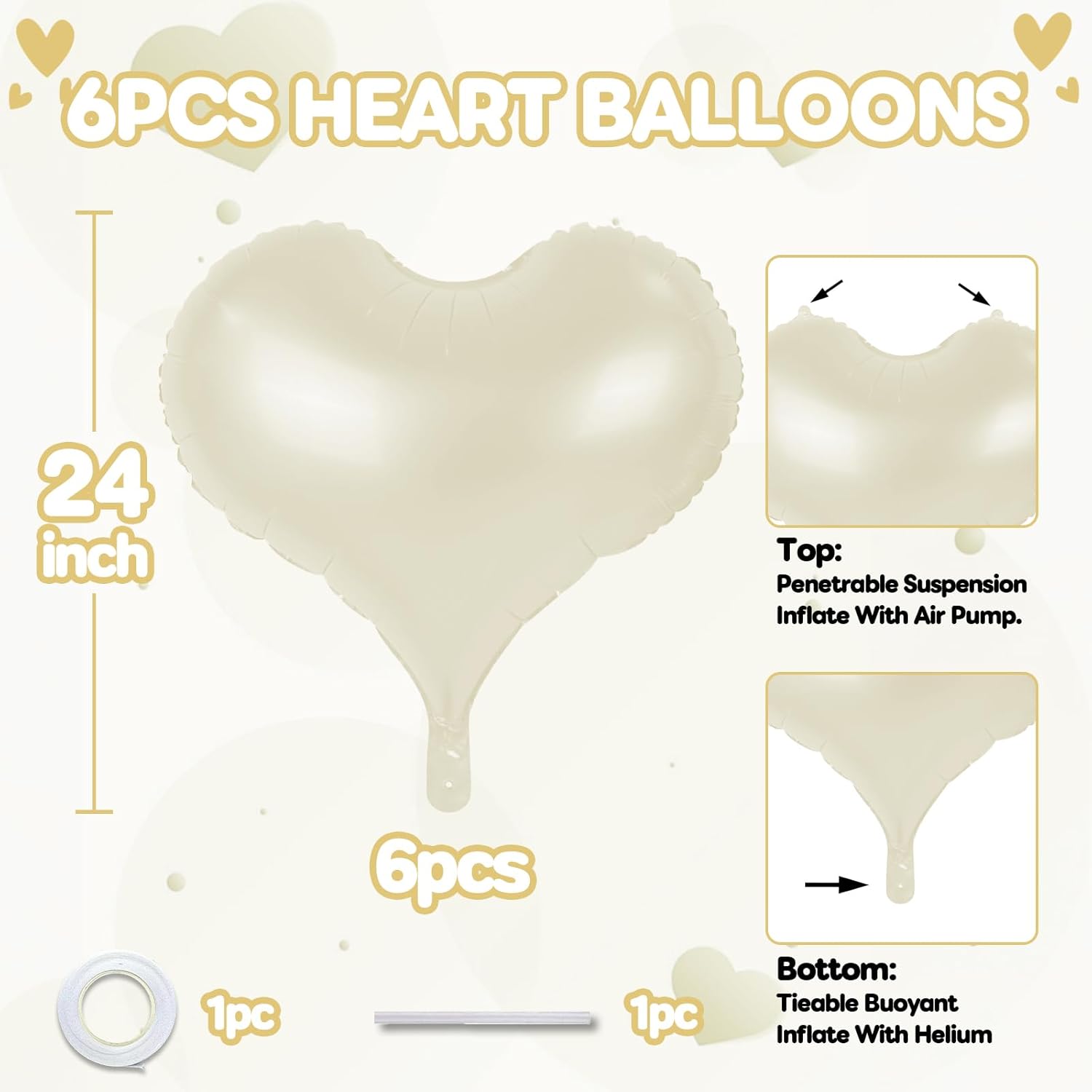 - 24 Inches Heart Balloons - Package contains 6 pcs cream white heart balloons, 1pc straw and 1pc ribbon.The cream heart shaped balloons are ideal for any party. 24 inch is big and special enough to decorate your party.