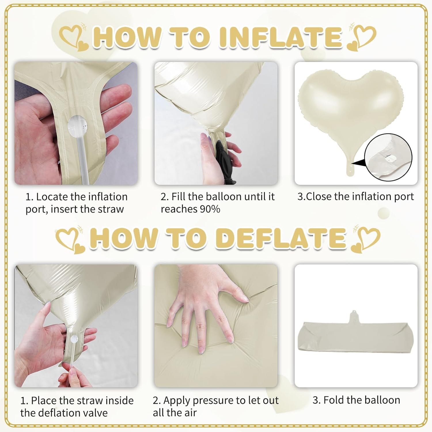 - Easy to Use - Effortlessly inflate our heart shaped foil balloons using the included straw. (If you want a floating effect, you can use helium)Simply pinch the self-sealing valve when full. It can be easily hung on the wall, ceiling or balloon garland, and it looks more advanced as a photo-taking tool!