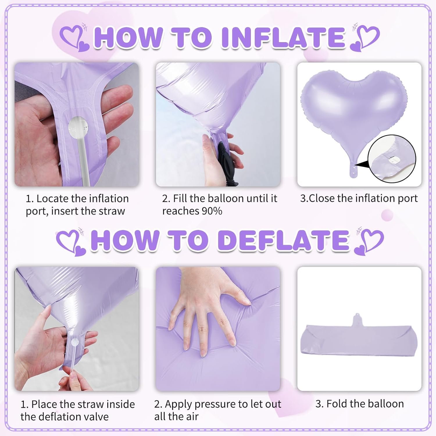 - Easy to Use - Effortlessly inflate our heart shaped foil balloons using the included straw. (If you want a floating effect, you can use helium)Simply pinch the self-sealing valve when full. It can be easily hung on the wall, ceiling or balloon garland, and it looks more advanced as a photo-taking tool!