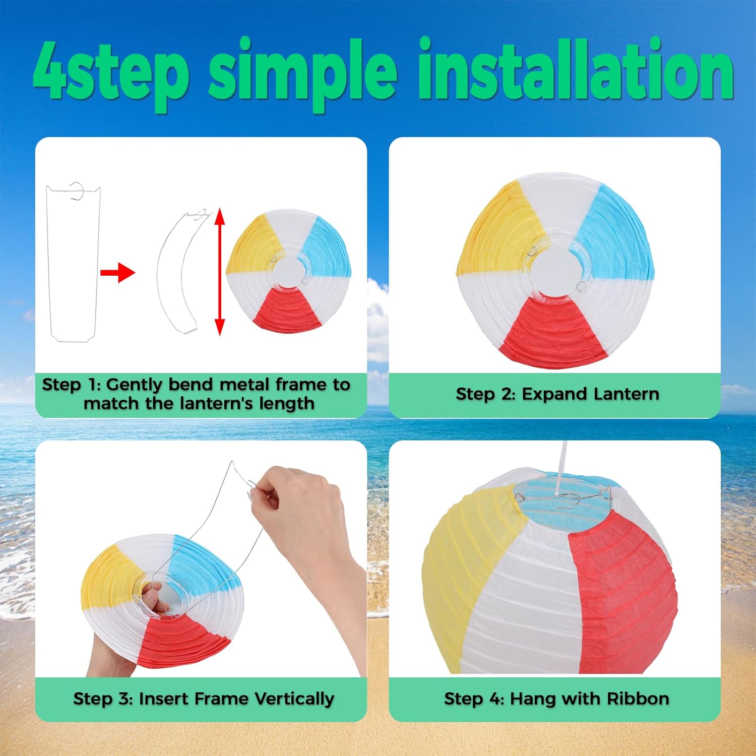 - 15pcs Beach Ball Paper Lanterns Kit: Paper lanterns (8×8" + 6×6") with metal frames, 6 color blocks, 2 ribbon rolls & guide. Excludes lights, stickers, and markers.