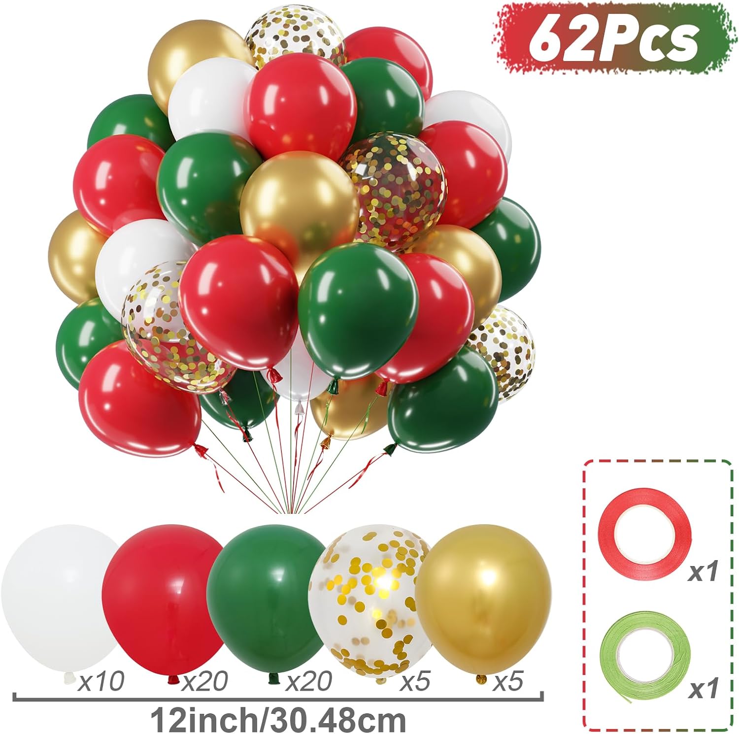 Christmas Red Green Gold Balloons Set, 60Pcs 12 Inch Red Green White Metallic Gold Confetti Latex Balloon Kit for Christmas Grinch Birthday Party Decorations