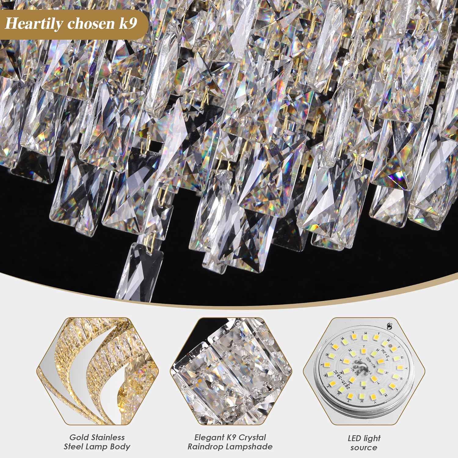 - Crystal flush mount gold ceiling light: made of K9 crystal and stainless steel; 3 modes lights Warm/natural/white is adjustable with wall switch; Coming remote is easy to control for all functions and temp or brightness's control.
