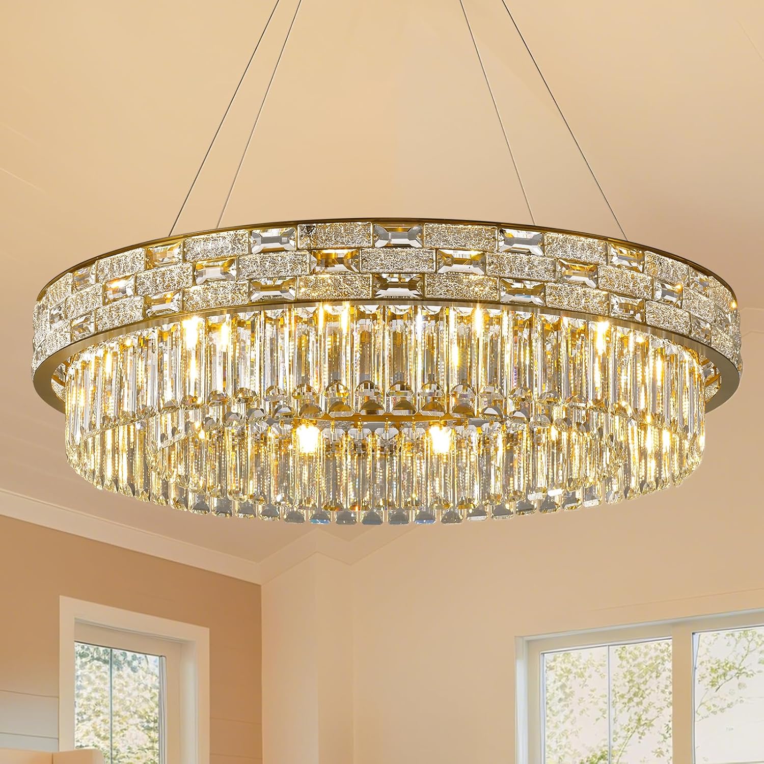 Crystal Chandelier, 31" 12-Light Large Chandelier for Living Room, Round Gold Chandeliers for Bedroom, High Ceiling Chandeliers, Foyer Lighting Fixtures Hanging Lights Dimmable