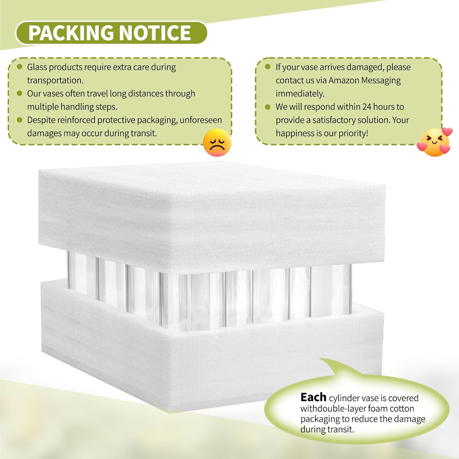 - ✅ Safe Package: Each glass cylinder vase arrives carefully protected with dual-layer foam cotton to prevent transit damage. But if anything arrives less than perfect? No worries. Just message us via Amazon—we’ll respond within 24 hours and make it right. Your happiness is our priority!