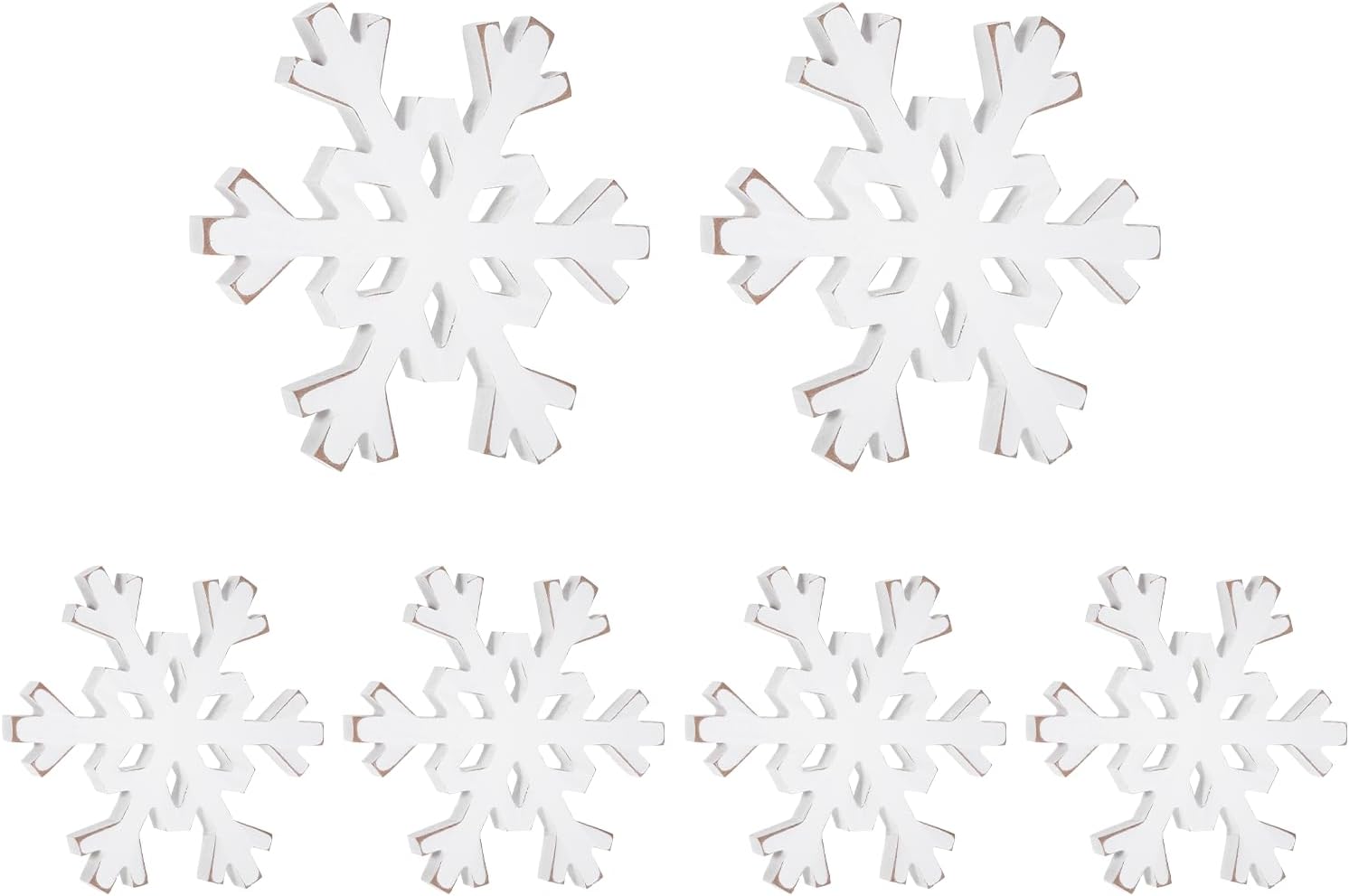- Value Pack: You will receive 6 white wooden snowflakes, including 2 large wooden snowflakes 4 small snowflakes. Large ones are 15cm wide, small ones 10cm, all 1.2cm thick. This versatile size combo fits Christmas tabletop decor, tiered tray, or shelf, meeting your winter and Christmas decorations needs perfectly as standing Christmas decorations.