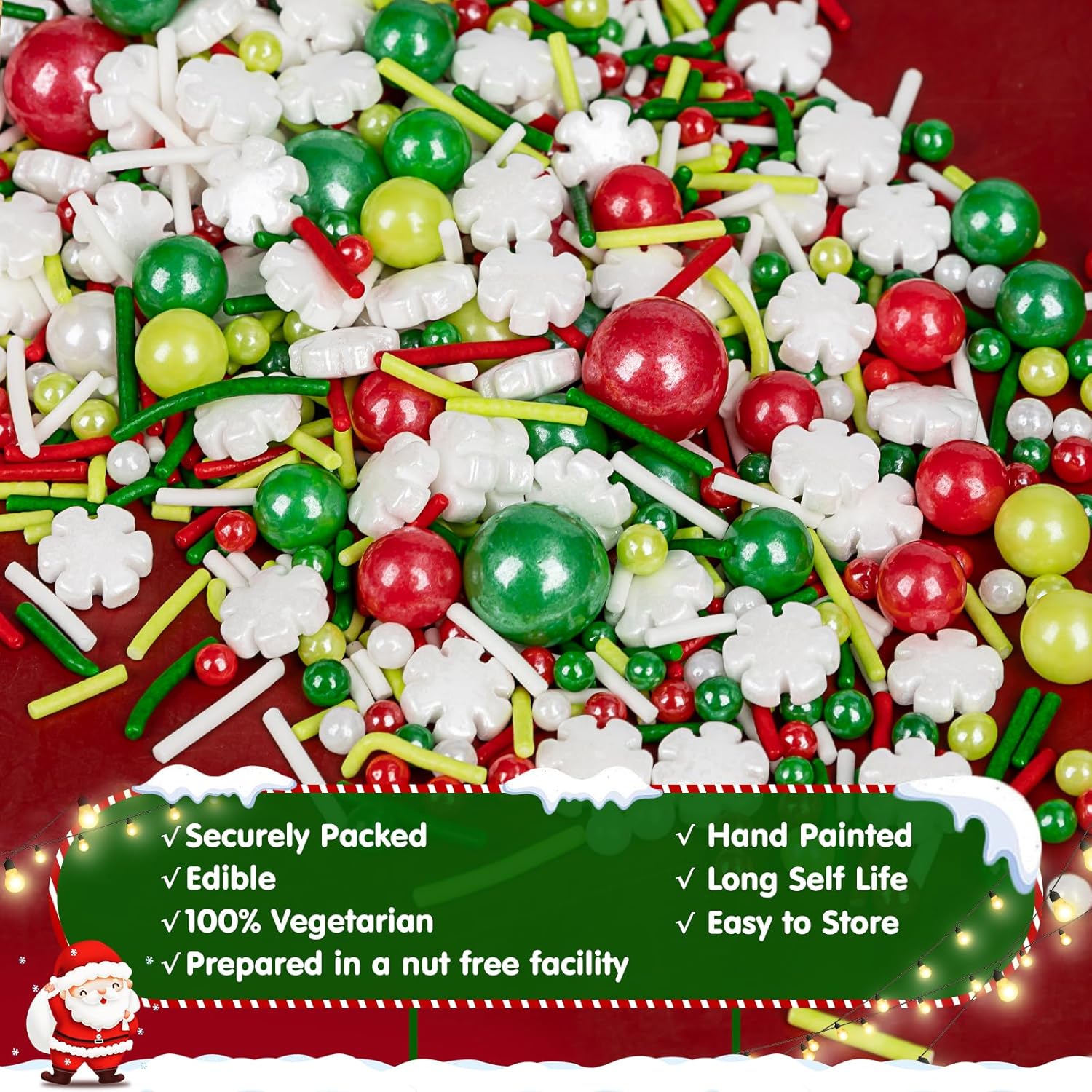 Christmas Snowy Night Sprinkles for Cake Decorating,130g White Snowflake and Red White Green Pearls and Jimmies Mix,Edible Sugar Holiday sprinkle for Cupcake Toppers, Cookie, Ice Cream Decorations Christmas Party