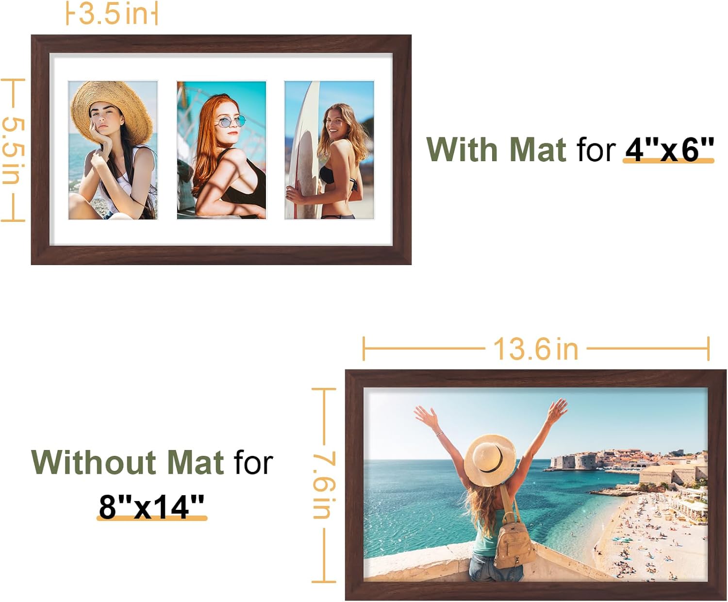 Vittanly 8x14 Picture Frames Collage, Displays 3Pcs 4x6 Pictures with Mat, Collage Picture Frame for Horizontal or Vertical Display, Brown, 1 Pack