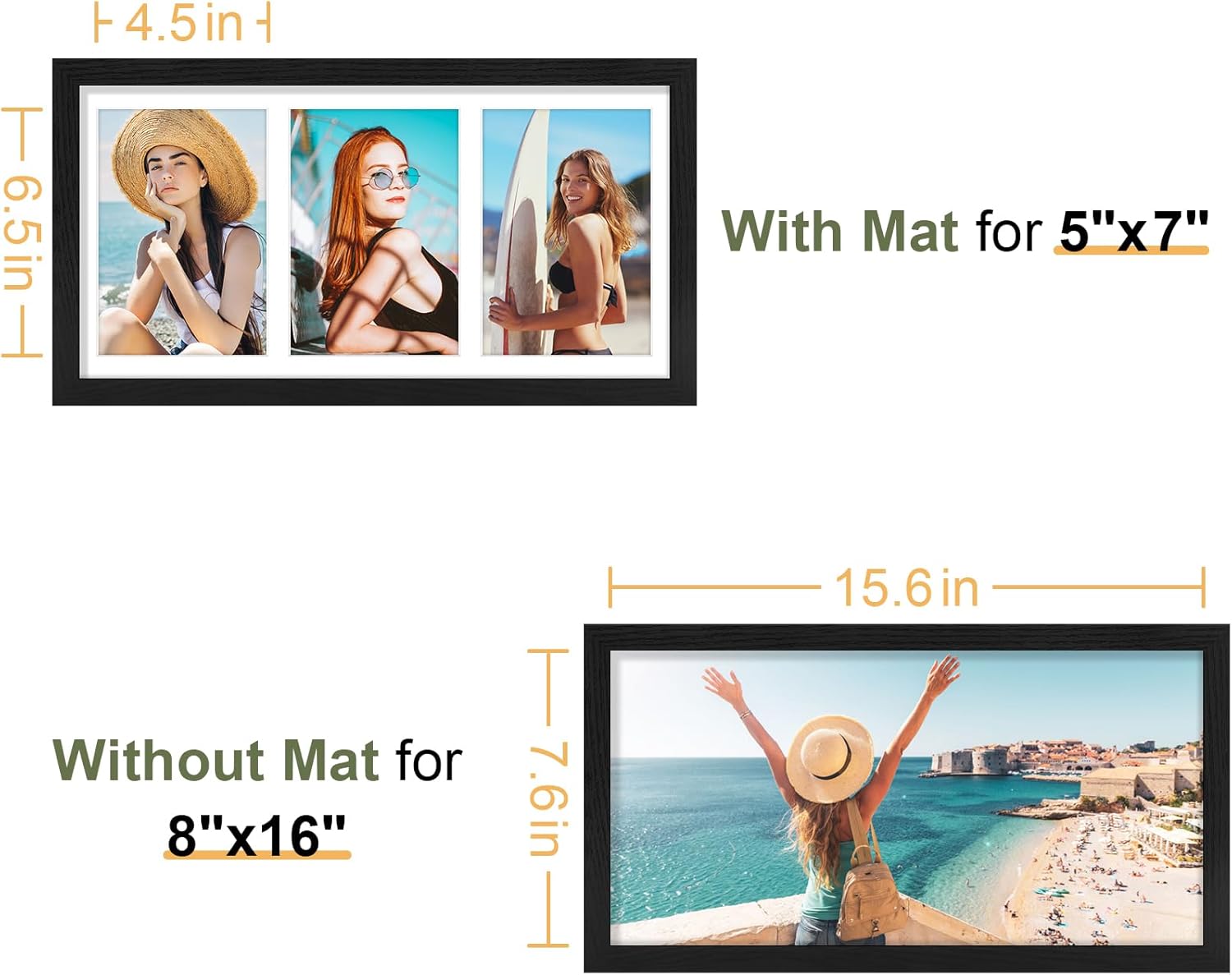 - Perfect Photo Fit: The 8x16 collage frame holds three 5x7 photos with mat or one 8x16 photo without mat. Each 5x7 opening is designed 0.5 inches smaller for a secure grip in this classic black frame