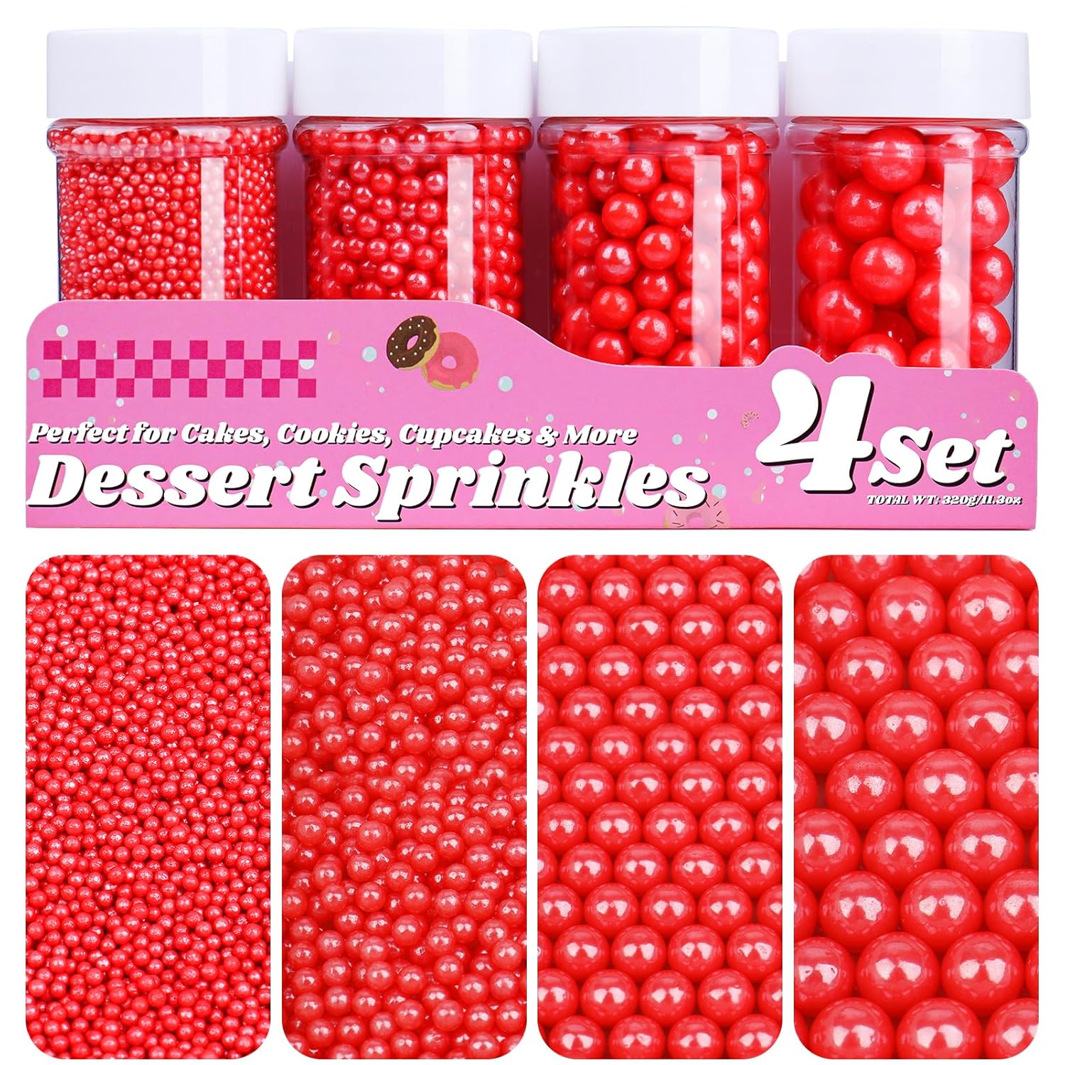Red Pearl Sprinkles for Cake Decorating, 11.3 Oz Edible Pearls Sugar 4 Sizes Gift Box Set for Baking Cookie Ice Cream Cupcake Toppings