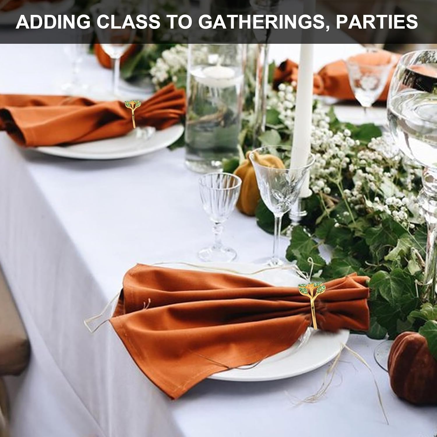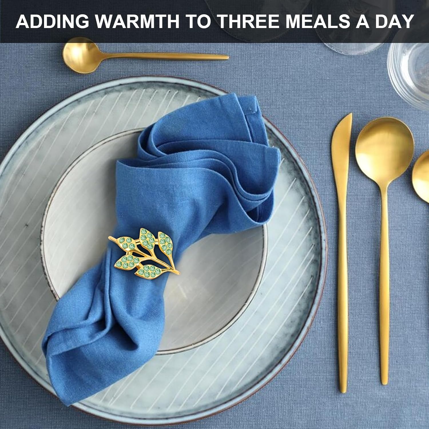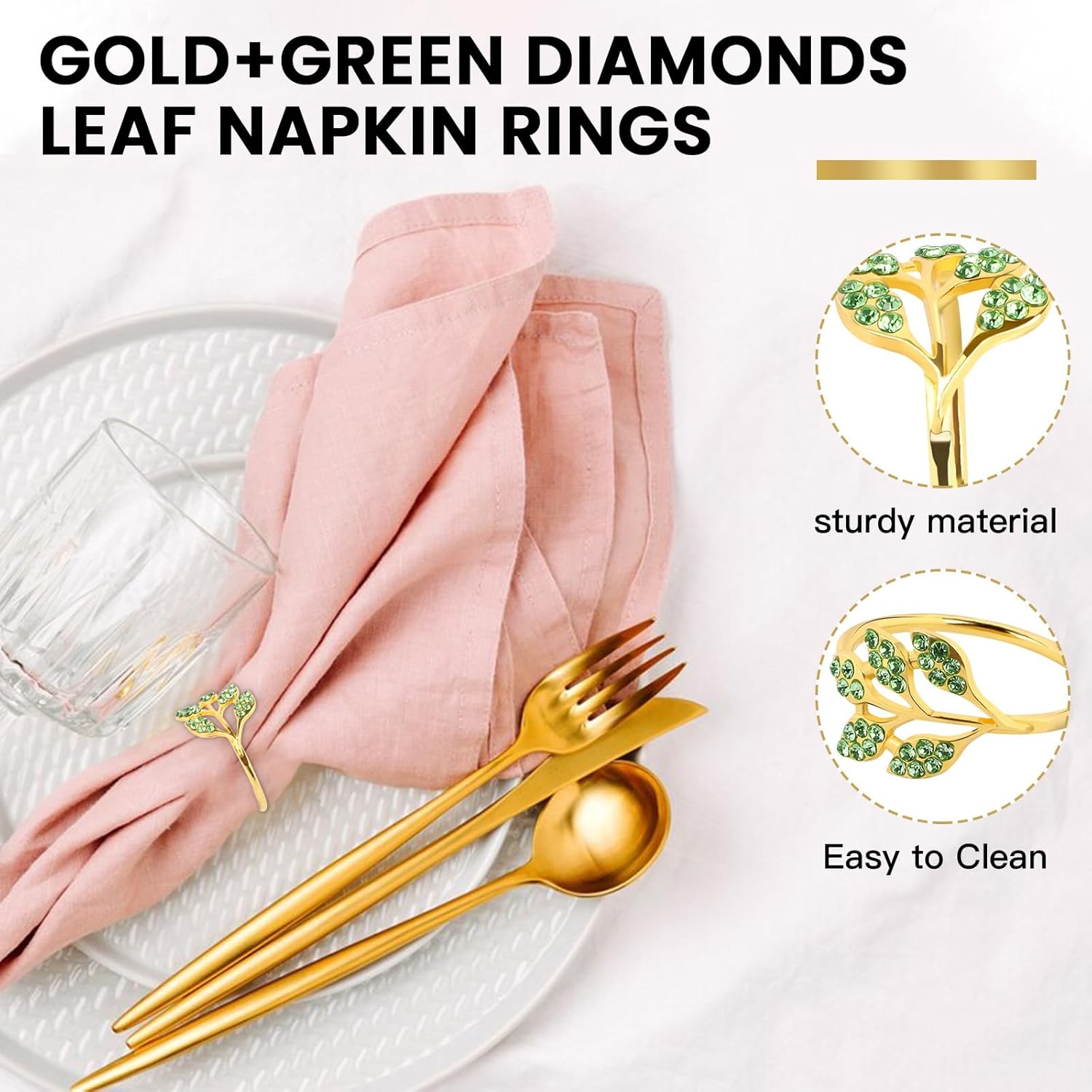 - Leaf Diamonds Napkin Ring Set: You will receive 10pcs metal napkin rings, design with leaf Gold Green Diamonds Diamonds, gold color+ Green Diamonds will add more gloss, which makes for an exquisite addition to the table setting,It would be a good choice for you add a romantic themed look to showcase your tabletop for family and guests.