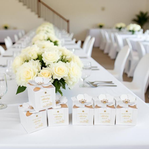 - 【Premium Material 】: 3.55x3.55x3.55 inches party favor boxes. Crafted from 350g thickness paper, durable sturdiness. With floral decor and gold foil white thank you tags, saving shopping time and designed exquisitely