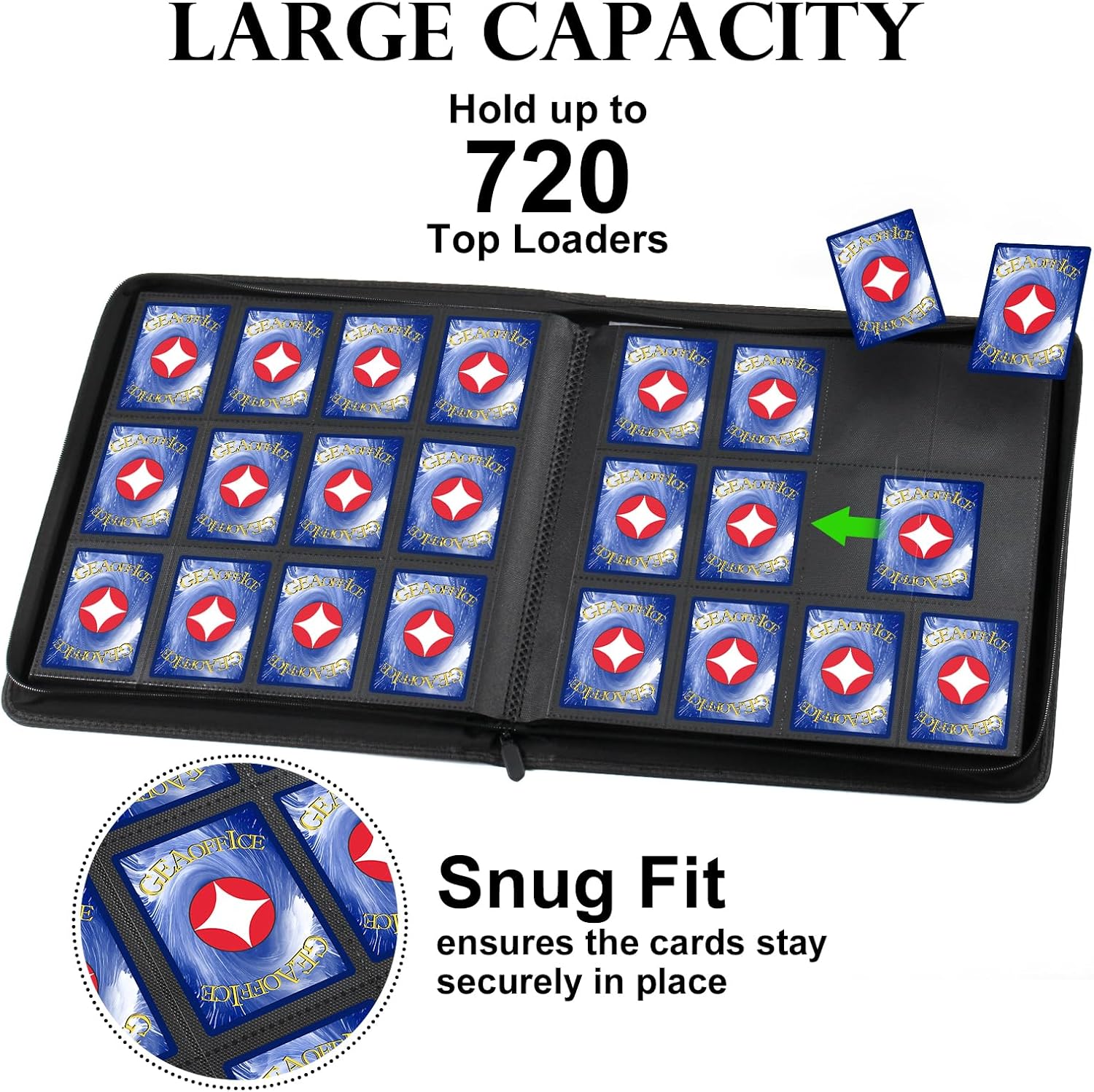 - Large Capacity - With 30 double-sided pages and 12 pockets per page, this trading card binder can hold up to 720 cards. Provides plenty of space for you to organize all your trading cards.