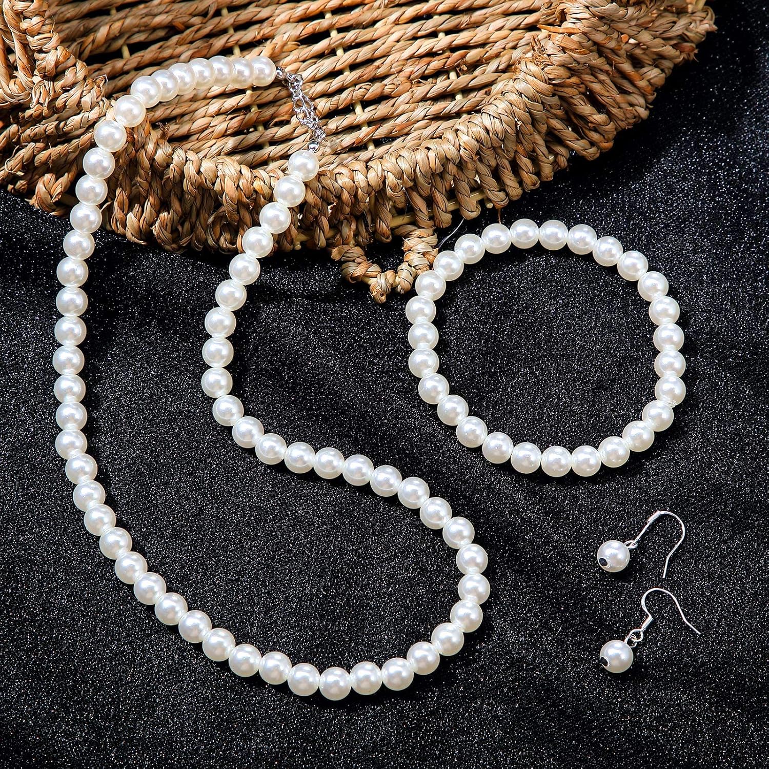 - Faux Pearl Jewelry Set: the faux pearl jewelry set includes 1 pearl necklace, 1 elastic beaded bracelet and 1 pair of pearl earrings, the necklace measures approximately 18 inches, the bracelet is 7.9 inches long, a set of matching pearl jewelry is worthy of your favor