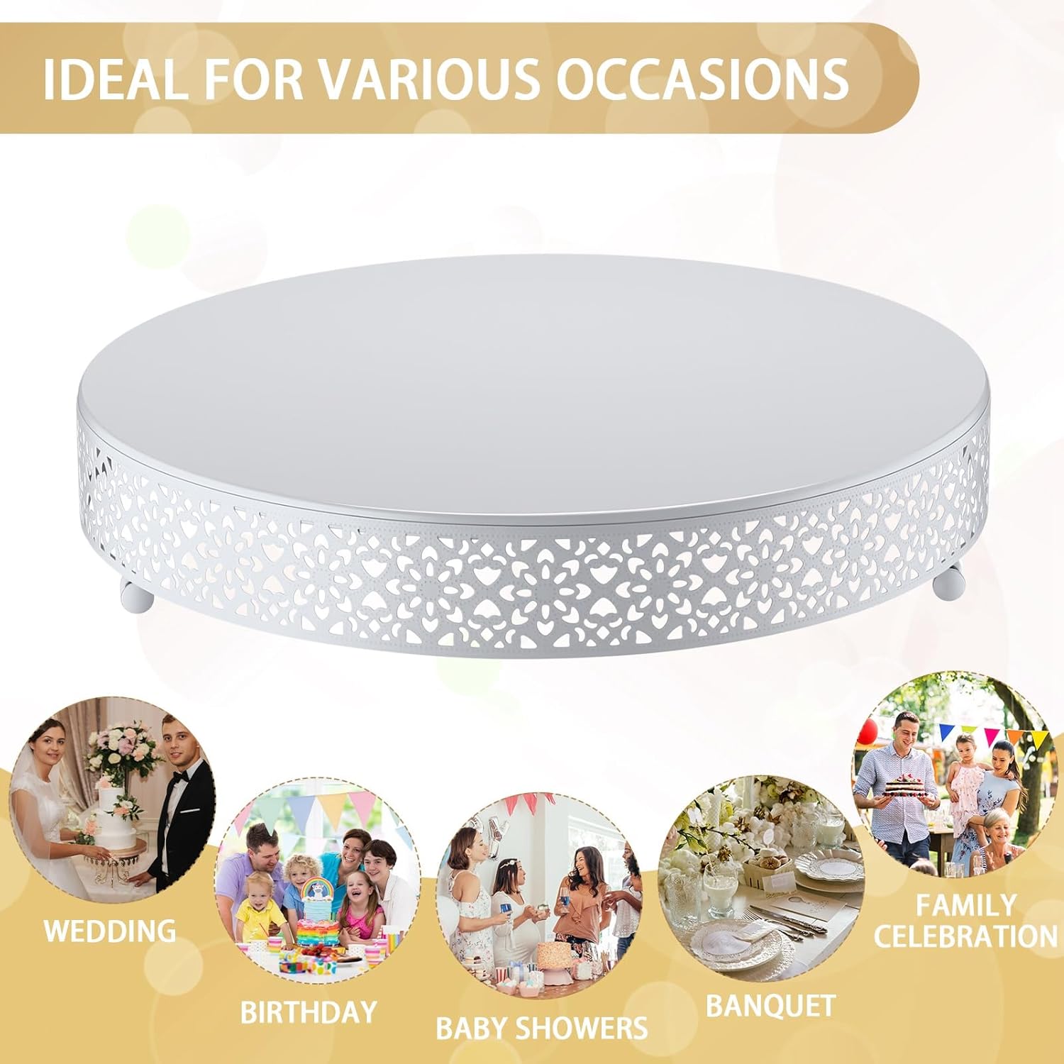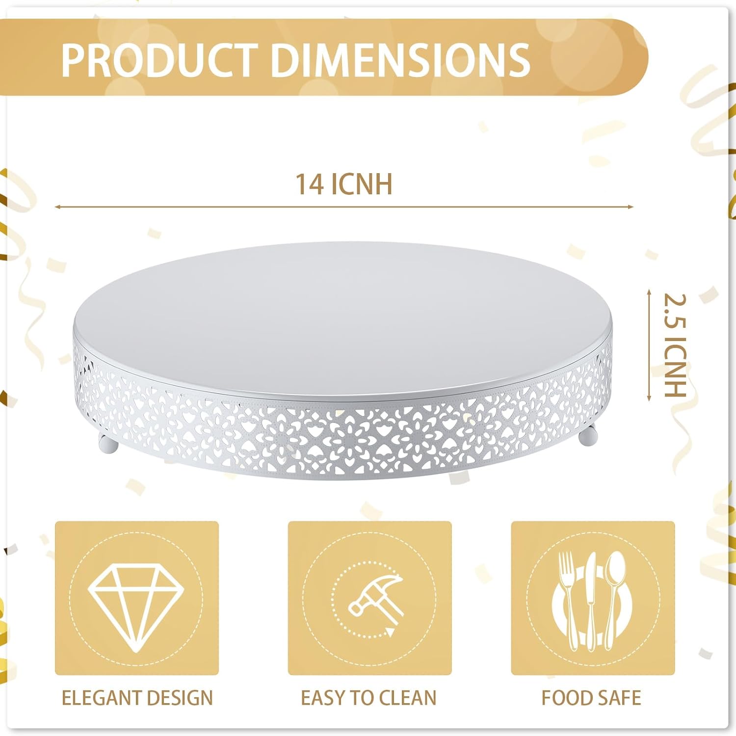 - Easy and Convenient to Clean: the design of this round cake stand makes it easy to clean and maintain; You can easily wipe it down with a damp cloth or sponge to remove any crumbs or spills; The metal material also makes it resistant to stains and scratches, ensuring that it stays looking nice even after multiple uses