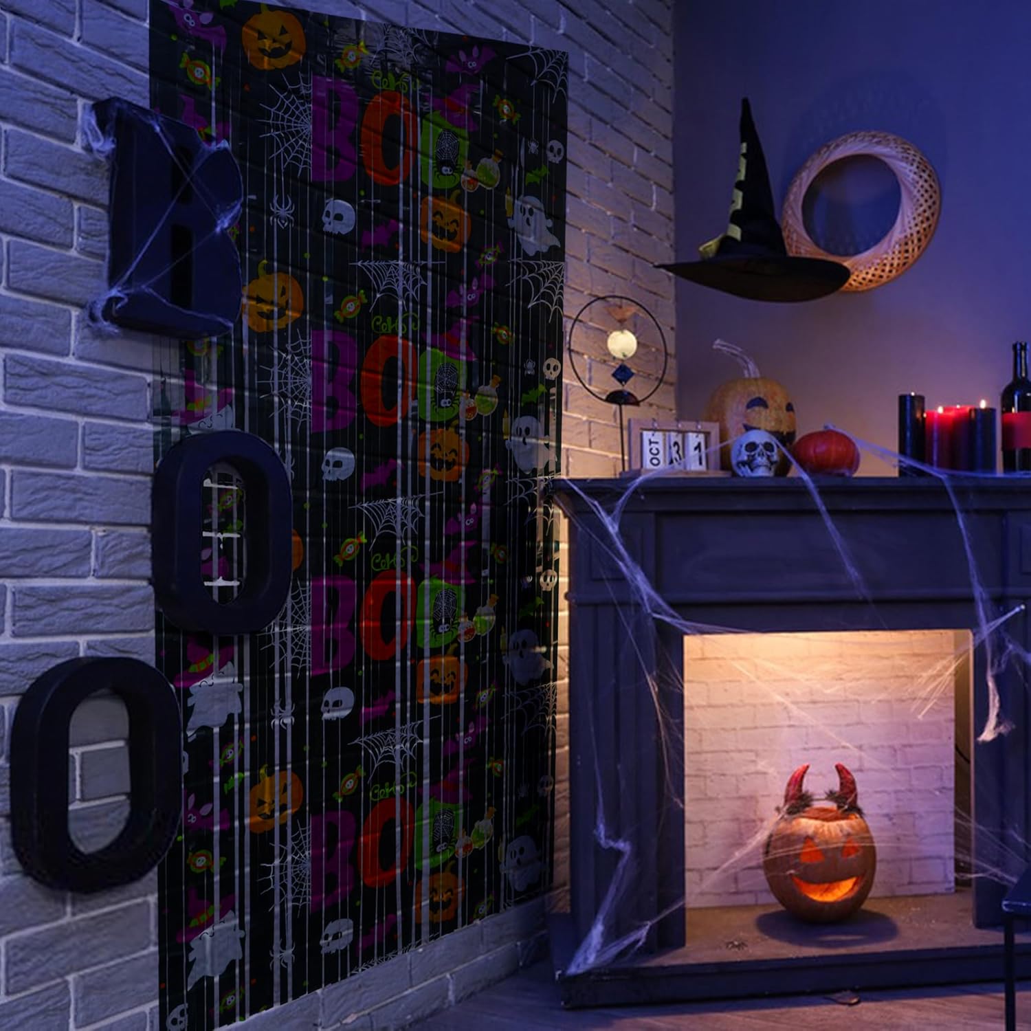 - Boo Themed Party Streamers bring a festive Halloween vibe with their shiny tinsel backdrop design. These foil fringe curtains are decorated with spooky details, making them a fun addition to your party décor.