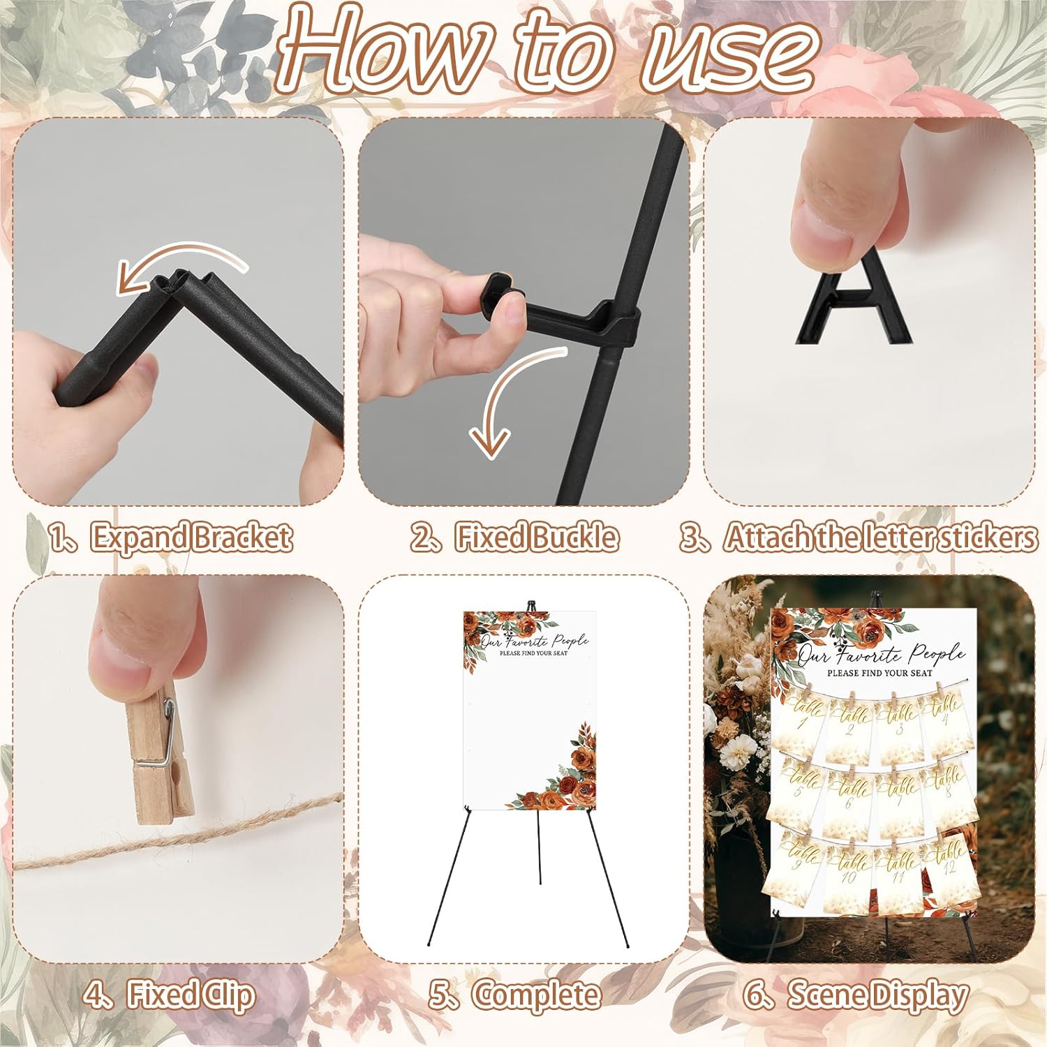 - Durable Material: the easel stand for display wedding sign adopts a rust-proof metal frame, a stable triangular structure, strong load-bearing capacity, and can be disassembled and assembled repeatedly; The seating chart is made of thickened wood material with a smooth and scratch-resistant surface; It is equipped with 20 durable wooden clips and thick hemp ropes, which are not easy to deform and break