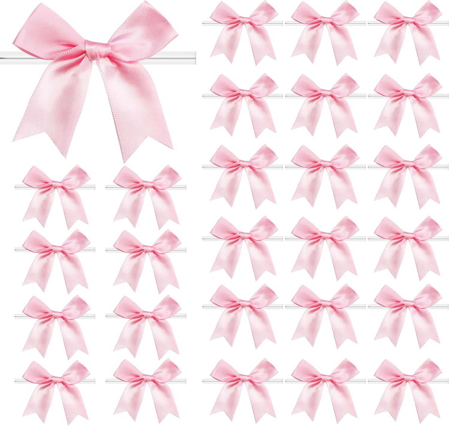 50 PCS Twist Tie Bows Satin Ribbon Bows 3.3 Inch Gift Wrap Bows Craft Bows for Gift Wrapping, Party Decorations Gifts Bag DIY Treat Bags Wedding Decor Baby Shower Christmas (Light Pink)