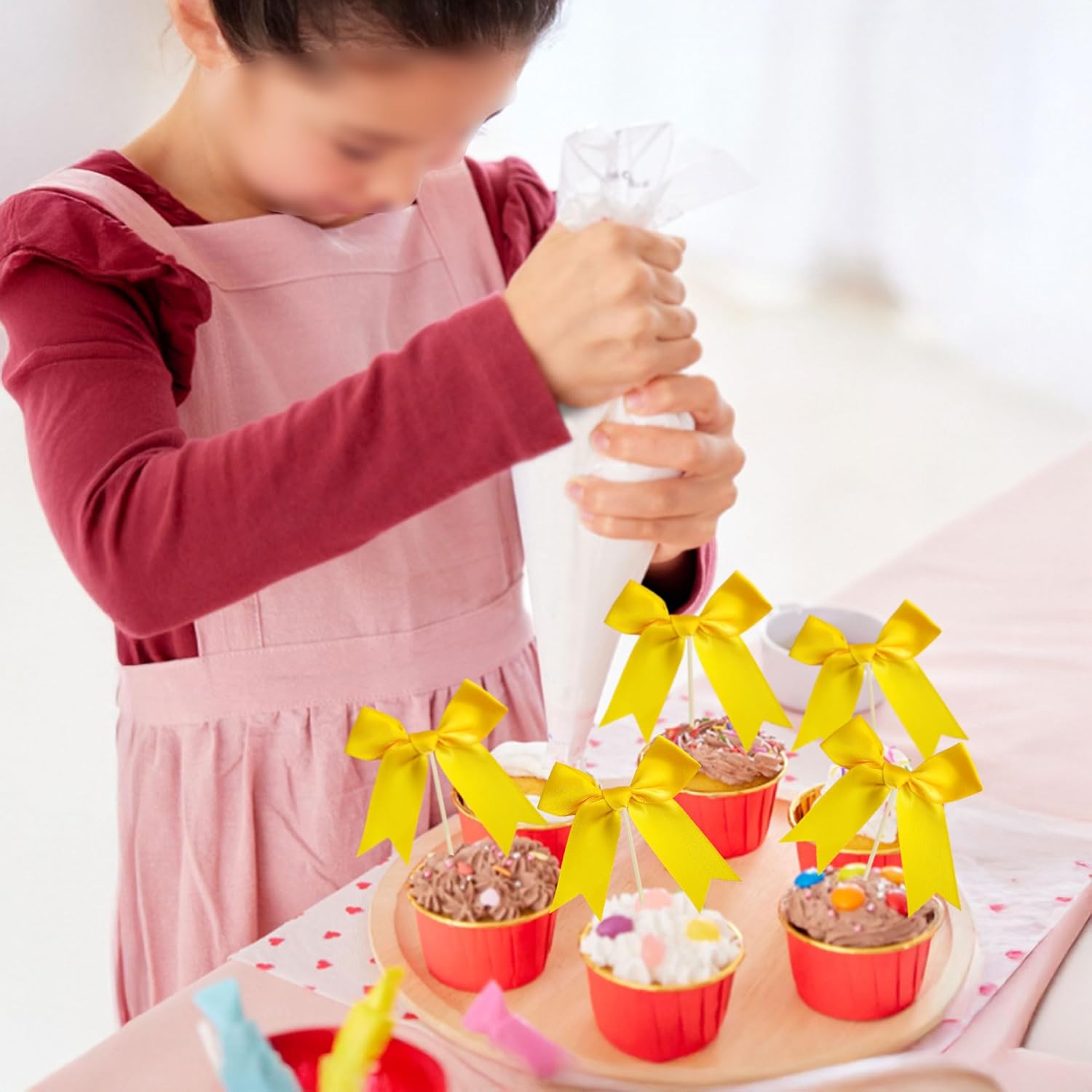 - --Premium Material: These Bow Cupcake Toppers are made of high quality polyester satin ribbon, very safe to put them on cakes, cupcakes, ice cream, fruits, pie, dessert, cheese or any dish and food appetizer you want to decorate bow theme party decorations.