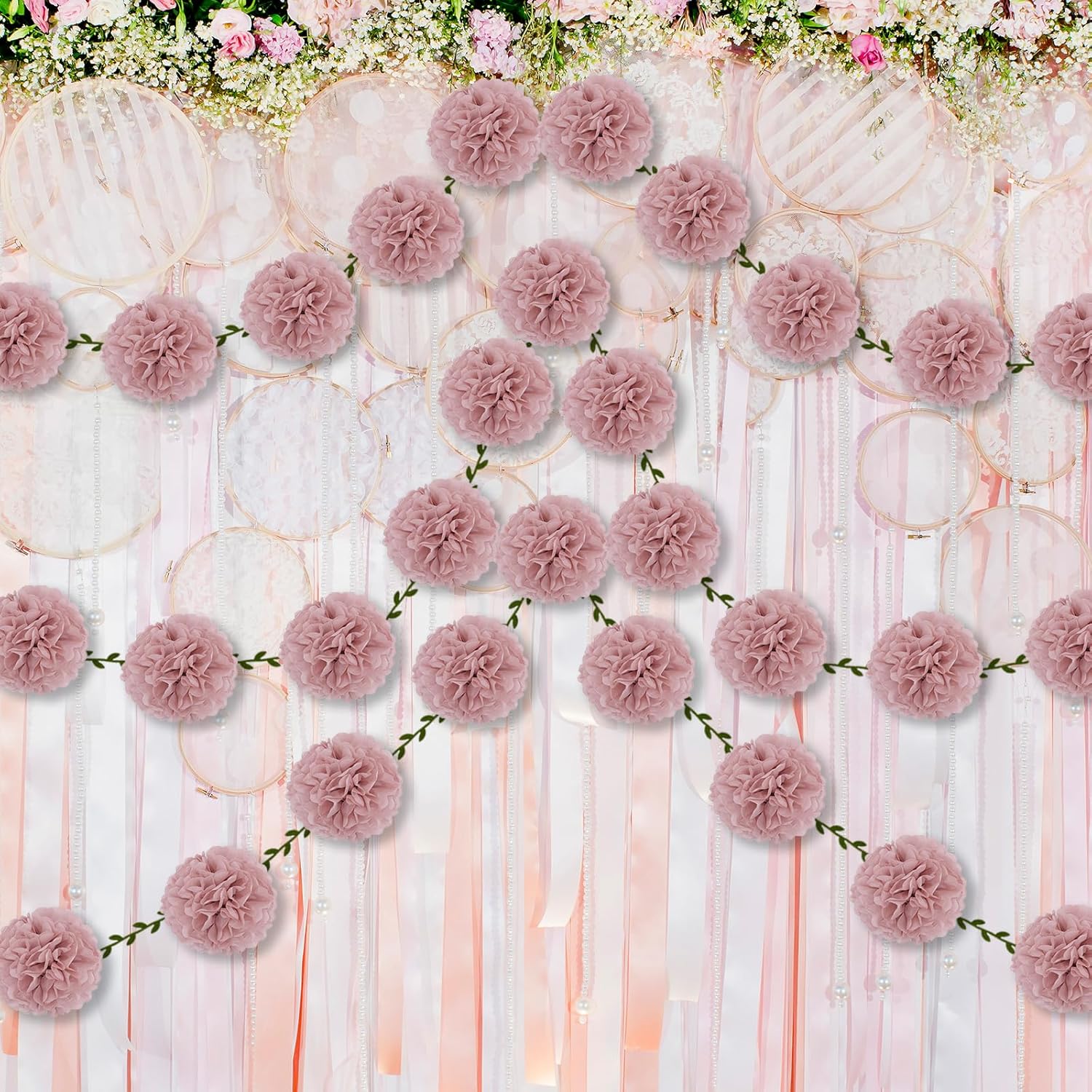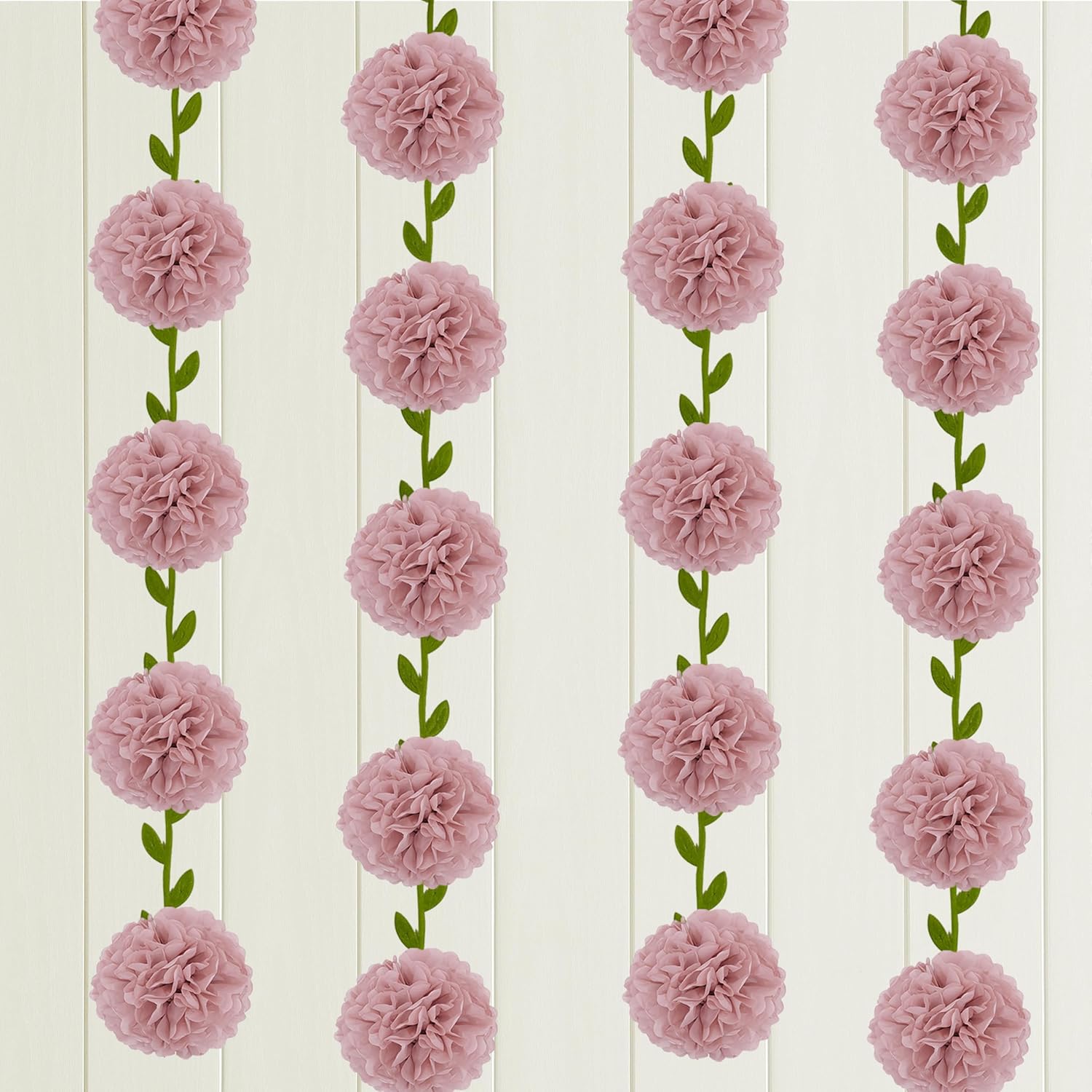 - [Packaging includes] 12x pre-strung 6 inches Rose pink soft tissue paper pompoms, 2x 6.6FT Vine garland banner
